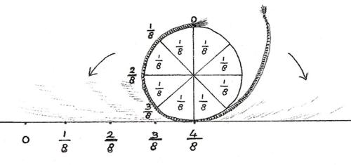 Begonnen wordt het breukenwerk uit de vierde klas nog eens op te halen. Daarin komt nu ook een reflectief moment, waarin de breukenwereld en wat daarin gebeurd is, op zichzelf in beschouwing genomen wordt. Bij het terughalen en opfrissen treden verschuivingen in kwaliteit en aandacht op. De kinderen gaan op een hoger niveau werken in hun ontwikkeling: van nabootsend ‘dromend’ bewegen naar bewust ‘wakker’ denkend bewegen; van beschrijven naar bewerken; van breukentaal naar rekenen met breuken. Dat terugkijken introduceren we door nog eens naar de 1 te kijken. De kwaliteit van het getal 1 heeft al een hele geschiedenis doorlopen. In de eerste klas zagen we dat er maar één heelal was, die 1 was meteen het ‘grootste’ getal. Maar als je maar één steentje had om te tellen, was 1 het minste. Vorig jaar was er één pannenkoek, een 1, die weer met velen gedeeld moest worden en opnieuw heel groot bleek te zijn.
