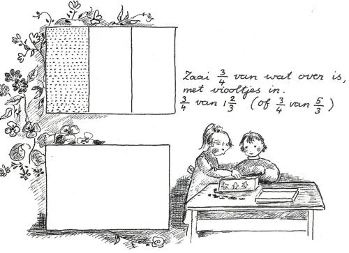 Ten slotte gaan we ook al in op het vermenigvuldigen met breuken. We doen dat op de aan het eind van dit hoofdstuk – als lesvoorbeeld- besproken manier van ‘landje indelen’.