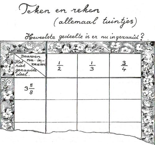 Verhaaltje 1: Het nieuwe terrein voor volkstuinen is verdeeld in 48 precies gelijke tuinen .Van de week is de inschrijving begonnen. Het eerste uur was nog maar het 1/16 deel uitgegeven, maar de rest van die dag werd er ¾ van de tuinen verhuurd. Welk deel van het totale park was er toen verhuurd?”