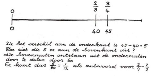 Het zou beter geweest zijn de opgave 3/4 – 2/3 = … met benoemde breuken aan te bieden: 3/4u – 2/3 u = … In de oplossing boven was dan gekozen voor u = 60 (één uur, of 60 kilometer, of…) ¾ u is dan ¾ x 60 = 45.