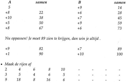 • Getallendictees waarbij vervolgens het eerste getal wordt vermeerderd met 1, het volgende met 2, het derde verminderd met 1. En dan opnieuw +1, +2, -1, enzovoort.