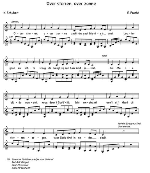 een betekenis.” Dat geldt ook voor het lichtje dat de kinderen dragen. Hun kaarsje is gestoken in een gouden ster, in een appel. Die ster verwijst naar de ster die de herders en de drie koningen de weg wees naar de stal. De sterrenkracht die in de aarde huist, ook al zien we het niet, kunnen we opvatten als een teken van hoop en houvast. De appel verwijst naar de boom van kennis van goed en kwaad – in het hart van het Paradijs – waar ook de zondeval begon.