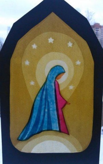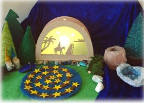 Blauwe kleuren als ondergrond en achtergrond, Jozef en Maria gaan op weg om op de dag van de kerstviering aan te komen in het stalletje; de grote engel daalt iedere week een stapje naar beneden, de berg met gouden noten [er zit voor ieder kind een klein geschenkje in] als adventkalender, het stalletje en kribje staan klaar en er liggen wat mooie mineralen.