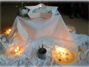 In een schaal met een laagje water (symbolisch voor de bron van alle groeikracht) worden kaarsrestjes opgebrand.