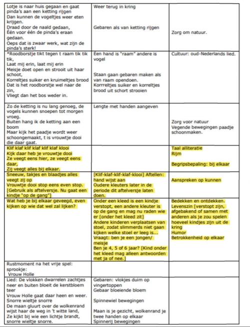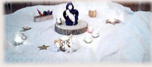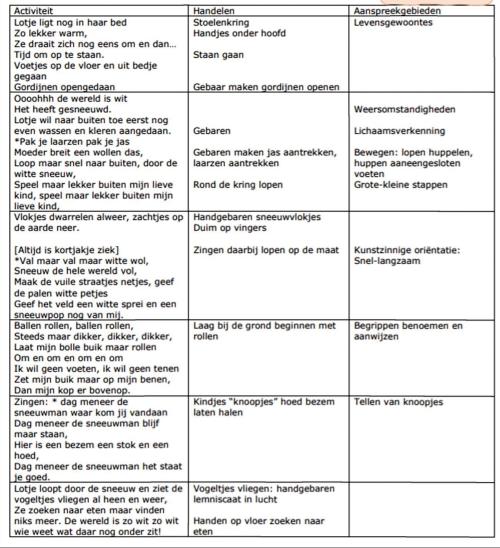 Koning Winter kan plotseling verschijnen en het donkere winterlandschap veranderen in een witte wereld. Binnen kunnen we met behulp van kleine witte lapjes en wattenvlokjes op het donkerblauwe achterdoek het beeld van de besneeuwde wereld oproepen. Als Vrouwtje Dooi haar werk doet, kunnen we door het verschuiven van de witte lapjes en wattenvlokjes kale aardeplekken tevoorschijn toveren, waar groene punten van bolgewassen tevoorschijn komen. Maar boven alles gaat het om het gebaar van de opvoeder, de ouder de leerkracht. Als mens, ben je voorbeeld voor een nieuwe generatie. En dat geldt niet alleen voor het vroegste voorjaar maar voor het hele jaar: zelfs voor het hele leven.