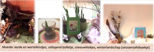 Op de Seizoenstafel kan Moeder Aarde met haar wortel- en bloemenkinderen de gang buiten nog eens zichtbaar maken. Een Moeder Aarde-figuur, uitgewerkt met sleutelbos en bril, of misschien wel heel figuratief door haar samen te stellen uit een mengeling van (gewikkelde) sprookjeswol.