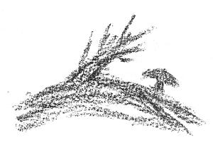 Nun muß man dem Kinde beibringen – und da wird man schon eher so vorgehen können -, wenn hier die Erde ist (siehe Zeichnung), die Erde nun etwas auswächst, einen Hügel erzeugt. Aber der Hügel, der wird von den Kräften der Luft und schon von den Kräften der Sonne durchsetzt. Er bleibt nicht mehr Erde. Er wird etwas, was zwischen dem saftigen Pflanzenblatt und auch schließlich der Pflanzenwurzel und der trockenen Erde mitten drinnen steht: er wird Baumstamm. Und auf der also ausgewachsenen Pflanze wachsennun erst die einzelnen Pflanzen, die die Äste des Baumes sind. So daß man kennenlernt, wie eigentlich der Baumstamm eine aufsprossende Erde ist.