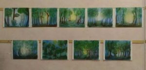 Ik vond het op zeker ogenblik zinvol om vóór de nieuwe schilderles, de resultaten van de vorige dan pas te bespreken: wat was de opdracht en waar is dat gelukt, vind je. Bij zo’n vraag moeten de kinderen naar alle schilderingen kunnen kijken, dus moeten die overzichtelijk zichtbaar zijn. Dat kan door ze op te hangen. Of, wat ik ook vaak deed, er een stuk of 6 naast elkaar (met tussenruimte) tegen het bord, in de krijtbak, te zetten.