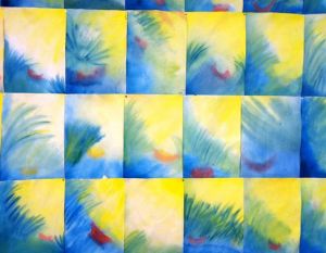 Het papier wordt op de planken bevestigd met plakstrips van stevig papier, vooral wanneer je ‘sluiert’. [ik gebruikte de op school aanwezige banderolle-plakstrip.] Voor nat-in-nat-schilderen is bevochtigen voldoende voor sommige papiersoorten. De 6 basiskleuren van de firma Stockmar in Kaltenkirchen worden in Nederland geleverd door de firma Mercurius.
