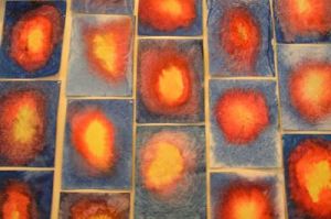 Als Kunstzinnig Therapeut Beeldend leg ik het ‘Zweeds therapeutenpapier’ bij het nat-in-nat schilderen zónder het vast te plakken op de schilderplank. Ik maak het papier aan beide zijden nat met een (natuur)spons en ik maak het daarna waar nodig weer iets droger met een stukje van een laken erop, vooral wanneer de cliënt iets te veel water heeft gebruikt. Bij het neerleggen zorg ik dat het papier goed plat ligt, zonder luchtbellen eronder. Vastplakken van het schilderpapier doe ik alleen bij sluieren, maar dat is een hele andere techniek, waarbij je een nat papier echt opspant, maar daarna juist schildert op het opgedroogde papier. De nat-in-nat schildering bobbelt soms inderdaad een beetje na het opdrogen, maar dat vind ik geen probleem. Ik zorg wel altijd dat het langzaam aan de lucht droogt en niet in de volle zon of boven een verwarming.