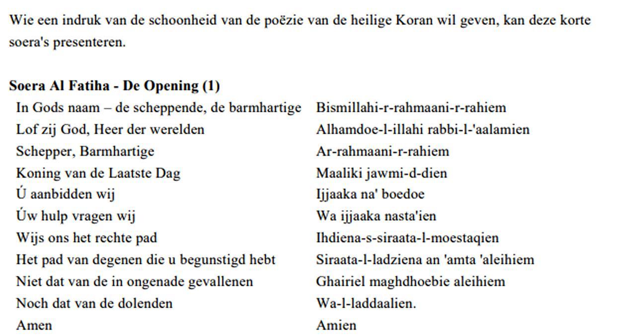 DE BIOGRAFIE VAN DE PROFEET MOHAMMED Bewerkt ten behoeve van het hoofd- of godsdienstonderwijs in de zesde klas van de vrijeschool (Nederland) of steinerschool (België) Ik stierf als een steen en als plant ontsproot ik. Ik stierf als plant en keerde weer als dier. Ik stierf als dier en werd een mensen-ik. Wees niet bevreesd, de dood heeft mij niet tekort gedaan. Als mens tilde hij mij van de aarde Opdat ik engelvleugels dragen mocht. Ook als engel ben ik niet onsterfelijk Want eeuwig is slechts het aangezicht van God. Mijn vleugelslag verheft mij boven engelsferen, Tot onmeetbaar hoge hoogten. Dan roept het niets mij, want in mij klinkt als harpmuziek De roep om wederkeer tot Hem. Mathnawi, boek III, vers XVII Vrij vertaald naar Jalaleddin Rumi: Ich bin Wind und du bist Feuer, in de vertaling van Annemarie Schimmel, uitgeverij Hugendubel, 2003 Lieve kinderen, ik ga jullie het verhaal van Mohammed ibn [1] Abd Allah ibn Abd al-Moettalib, profeet van de islam, vertellen. Toen Abd Allah, de laatste zoon van Abd al-Moettalib, de puberteit had bereikt, besloot zijn vader hem met Amina, dochter van Wahhaab ibn Abd Manaaf, te laten trouwen. Zij gingen beiden naar Wahhaab om hem om de hand van zijn dochter te vragen. Onderweg kwamen zij een vrouw van de Banoe Asad tegen, die, toen zij zijn gezicht zag, bleef staan en tegen hem zei: “Waar ga je heen, Abd Allah?” Hij wees op zijn vader die voor hem liep en zei: “Ik ga met mijn vader mee.” Zij zei: “Ik zou je evenveel kamelen geven als er voor je werden geofferd om je te redden [2] wanneer je mij nu onmiddellijk neemt.” Hij zei: “Ik begeleid mijn vader, ik moet met hem mee.” Zij kwamen bij Wahhaab, aan wie Ab al-Moettalib om de hand van zijn dochter Amina vroeg voor zijn zoon Abd Allah. Wahhaab stemde toe en Abd Allah ging bij Amina binnen en hij bekende haar nog dezelfde nacht. Zij werd zwanger van Mohammed. Toen hij de volgende ochtend onderweg was naar huis, kwam Abd Allah de vrouw van de Banoe Asad opnieuw tegen, die zich de vorige dag aan hem had aangeboden. Deze keer deed ze niets en keerde hem de rug toe. Hij zei tegen haar: “Waarom bied je me vandaag niet aan wat je me gisteravond hebt aangeboden?” Zij antwoordde hem: “Het licht dat jij gisteren uitstraalde is verdwenen. Vandaag verlang ik niet meer naar jou.” Iets later vertrok Aballah naar het land van Sjaam [3] om daar handel te drijven. Op de terugreis ging hij langs bij zijn ooms van moederskant, de Banoe an-Nadjjaar in Jathrib [4]. Hij werd ziek en stierf voordat zijn vrouw was bevallen. Aan het kind dat geboren moest worden, liet hij niet veel na. Amina liet Abd al-Moettalib, de grootvader van de pasgeborene, weten: “Er is een jongen geboren, kom hem zien.” Abd al-Moettalib ging naar haar toe, nam zijn kleinzoon en droeg hem in zijn armen naar de Ka’aba. [5] Hij dankte God dat Hij hem dit geschenk had gegeven en bad Hem zijn kleinzoon welstand en welvaart te geven. Toen bracht hij het kind naar zijn moeder en ging, zoals de gewoonte was, op zoek naar een voedster. Hij offerde een bok en noemde de pasgeborene