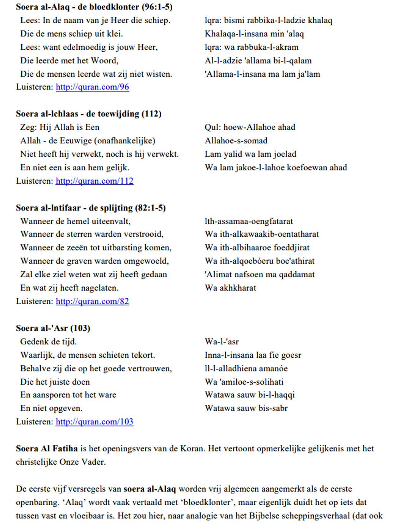 De eerste openbaring Mohammed was een devoot man. Regelmatig trok hij zich terug om te mediteren, vaak in een grot op de berg Hira een half uur lopen buiten Mekka. Toen Mohammed veertig jaar oud was, trok hij zich in de maand ramadan weer terug in die grot. In de nacht werd hij gewekt door de engel Djibriel, die hem opdroeg iets voor te dragen. “Reciteer,” sprak de engel, maar Mohammed zei dat hij dat niet kon. Hij wist niet wat hij moest zeggen. De engel herhaalde de opdracht en drukte Mohammed stevig tegen zich aan, zodat Mohammed bijna geen lucht meer kreeg. Maar Mohammed herhaalde dat hij niet wist wat hij moest zeggen. Nog eens gebood de engel hem te lezen en hij drukte Mohammed opnieuw tegen zich aan. Toen sprak de engel: Reciteer: In de naam van je Heer die schiep. Die de mens schiep uit klei. Reciteer: want edelmoedig is jouw Heer, Die leerde met het Woord, Die de mensen leerde wat zij niet wisten. lqra: bismi rabbik-alladzie khalaq Khalaqa al-insana min ‘alaq lqra: warabbuka-l-akram Alladzie ‘allama bi-l-qalam ‘Allama-l-insana ma lam ya’lam (Koran 96:2-6; luisteren: http://quran.com/96) Mohammed was zo bang dat hij door een demon bezeten was, dat hij zich van het leven wilde beroven. Hij rende de grot uit, maar zag daar aan de hemel de gestalte van de engel, die de hele horizon vulde. De engel sprak: “O Mohammed, jij bent de gezant van God en ik ben Djibriel.” Mohammed keek naar links en naar rechts, maar ook daar zag hij de gestalte van Djibriel. Mohammed rende in paniek naar huis en riep: “Wikkel mij in een deken. Ik ben bezeten!” Chadiedja wikkelde hem in een deken – Mohammad zweette hevig en klappertandde van de koorts – en zei tegen hem: “Ik geloof niet dat je bezeten bent.” Chadiedja ging naar haar neef Waraka ibn Naufal die christen was en vertelde wat Mohammed was overkomen. Deze vertelde haar over Djibriel en geloofde dat wat Mohammed was overkomen waar was. De boodschapper van God kreeg een tijdlang geen openbaring meer. Toen zij zijn verdriet zag, zei Chadiedja tegen hem: “Het lijkt alsof jouw God je in de steek heeft gelaten.” Zijn verdriet was zo groot dat hij verschillende keren op het punt stond om van een rots af te springen. Maar elke keer als hij op de top was aangekomen, verscheen Djibriel om hem te zeggen: “O Mohammed, je bent echt de gezant van God.” Na enige tijd openbaarde Djibriel: Bij de glorie van de dag. En bij de nacht als het donker is. Je Heer heeft je niet verlaten, noch is Hij ontevreden over jou. Voorwaar, het komende uur [11] zal beter zijn voor u dan het vorige. En voorwaar, je Heer zal je geven, en je zult tevreden zijn. Vond Hij je niet als wees en beschermde Hij je? En vond Hij je niet zoekende en leidde Hij je? En vond Hij je niet in armoede en verrijkte Hij je? (Koran 93:2-9) Er gingen enkele jaren voorbij waarin Mohammed meer openbaringen ontving die hij op de markt en bij de ka’aba verkondigde. Hij kreeg steeds meer volgelingen die hun afgoden afzworen en in de Ene God gingen geloven en een beter en eerlijker leven probeerden te leiden. Dat was tegen het zere been van de rijken en machtigen, die zich bedreigd voelden, omdat ze rijk waren geworden door list en bedrog en de armen en zieken aan hun lot overlieten. Toen Mohammed weigerde te stoppen met prediken, boden ze hem het koningschap aan, als hij zijn mond maar hield. Dat weigerde Mohammed natuurlijk. Zolang Mohammeds oom Abu Talib, die de leider van de stam Hasyim was, Mohammed beschermde, durfden de anderen Mohammed niets aan te doen, maar toen die overleed, beraamden ze plannen om van hem af te komen. Eerst boycotten ze de stam Hasyim in de hoop dat die Mohammed aan hen zou uitleveren of zou verbannen. Maar dat gebeurde niet. Hoewel niet alle leden van zijn stam Mohammed volgden, beschermden ze hem toch zoals je een stamgenoot hoorde te beschermen. Na enige tijd overleed ook Mohammeds geliefde vrouw Chadiedja. Mohammed zonk de moed in de schoenen, maar hield toch vol, gesteund door zijn trouwe volgelingen, zijn vriend Abu Bakr en zijn neef Ali, die vanaf het eerste uur in zijn boodschap geloofden. De nachtelijke reis Dit is het verhaal van de wonderbaarlijke reis die de Profeet Mohammed (mogen vrede en Gods zegeningen met hem zijn) met de engel Djibriel naar Jeruzalem en door de zeven hemelen naar God maakte. Oemm Hani, de dochter van Aboe Talib, vertelt. De Boodschapper van God was in mijn huis gaan slapen. Toen hij opstond, vertelde hij dat hij die nacht naar Jeruzalem was gereisd. Toen hij naar buiten wilde gaan, trok ik aan zijn kleren om hem tegen te houden, zodat zijn blote buik zichtbaar werd. Ik zei tegen hem: “O Boodschapper van God,