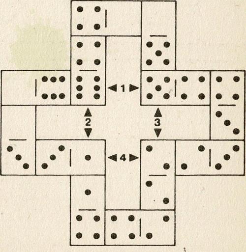 Dit spelletje kun je het beste spelen als je zelf een dominospel hebt. Je kunt ook de stenen overtekenen en dan uitknippen. Het is namelijk de bedoeling dat je de dominostenen uit de tekening zodanig 4 neerlegt, dat je op, de rijen, die door de cijfers 1 tot en met 4 staan aangegeven, een som krijgt van 20. Dat wil zeggen, datje als je de zwarte doppen van iedere rij bij elkaar optelt, steeds 20 als uitkomst krijgt.
