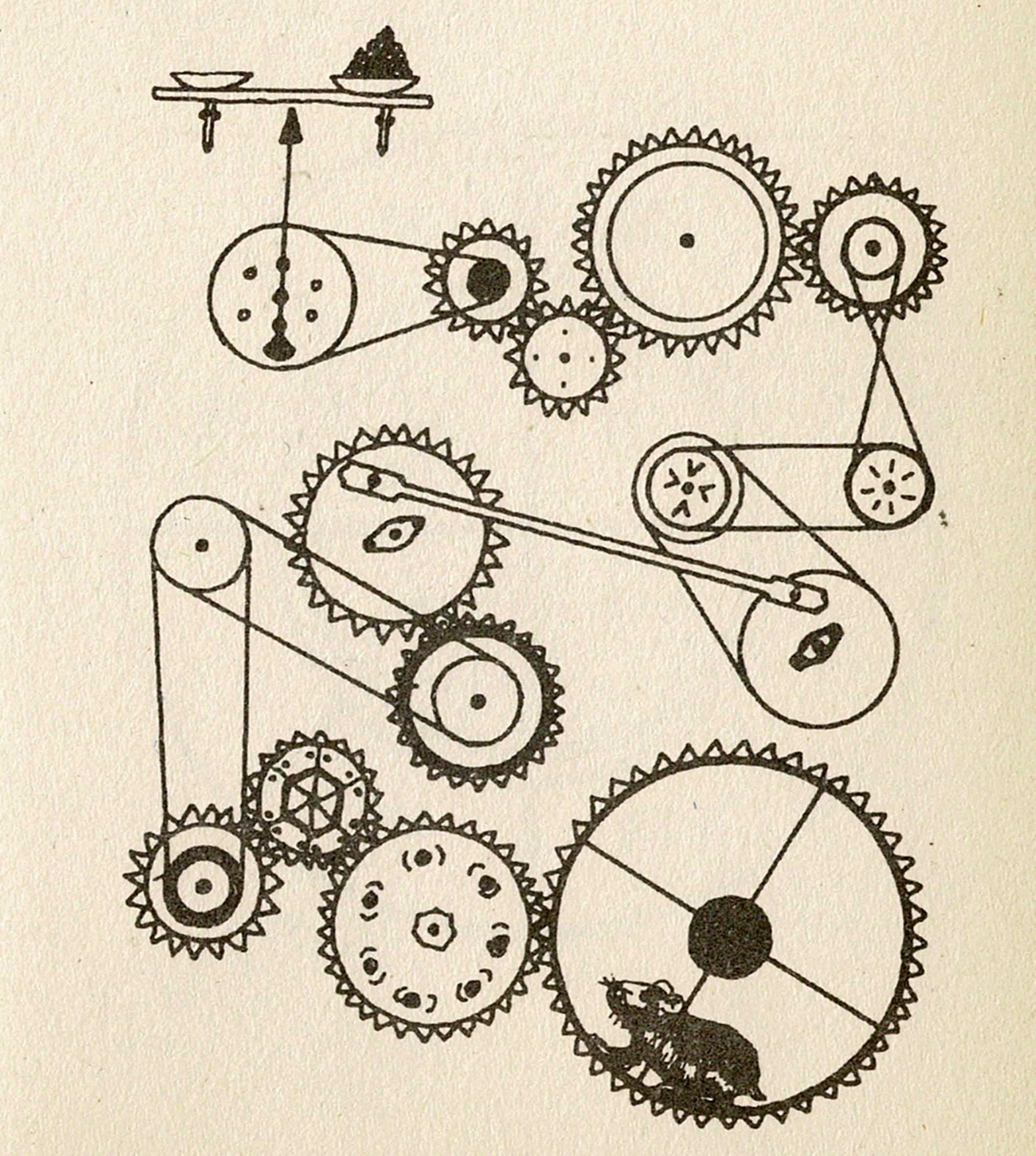 Wanneer de hamster in zijn wiel begint te lopen, beginnen ook alle radertjes te draaien, die een weegschaal naar een bepaalde kant doet overslaan.
