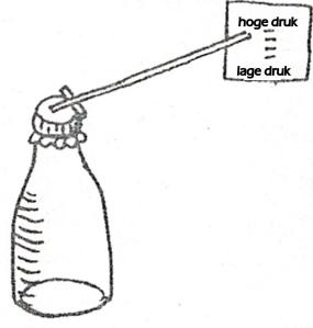 Daarvoor hebben we een fles nodig met een wijde hals (de oude melkfles) en daarover bevestigen we een stuk luchtballon en spannen het strak. Dan plakken we een strohalm midden op het membraan met een stukje lucifer eronder. Dan is hij al klaar, hij moet alleen nog op een plaats neergezet worden met gelijkblijvende temperatuur en op de muur moeten we een schaalverdeling plakken waarop de strohalm kan aanwijzen of hij hoger dan wel lager staat.