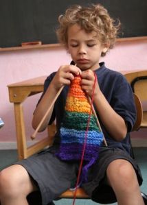 Handarbeitsunterricht Knaben und Mädchen strickend und häkelnd