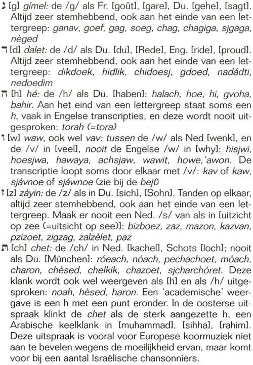 Het zingen van het Hebreeuws zal al gauw acceptabel klinken. U moet het uitspraakgedeelte van dit stuk eerder zien als middel tegen ontsporing. Alleen van cd’s met Israëlische populaire muziek zult u de ‘volmaakte’ uitspraak kunnen leren. Het boekje met de teksten zal echter in Hebreeuws schrift worden afgedrukt, en dat is toch een handicap.