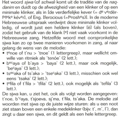 De sjwa kan, u ziet het, ook als volgt worden aangegeven: t’noe, b’caya, t’sjoeva, sj’ma, t’fila, ts’aka. De melodie zal woorden met sjwa op de juiste wijze sturen: als u een noot ziet staan boven een enkele medeklinker (bijv. t’, m’, I’), dan zingt u daar een sjwa, en dit geldt als een hele lettergreep.