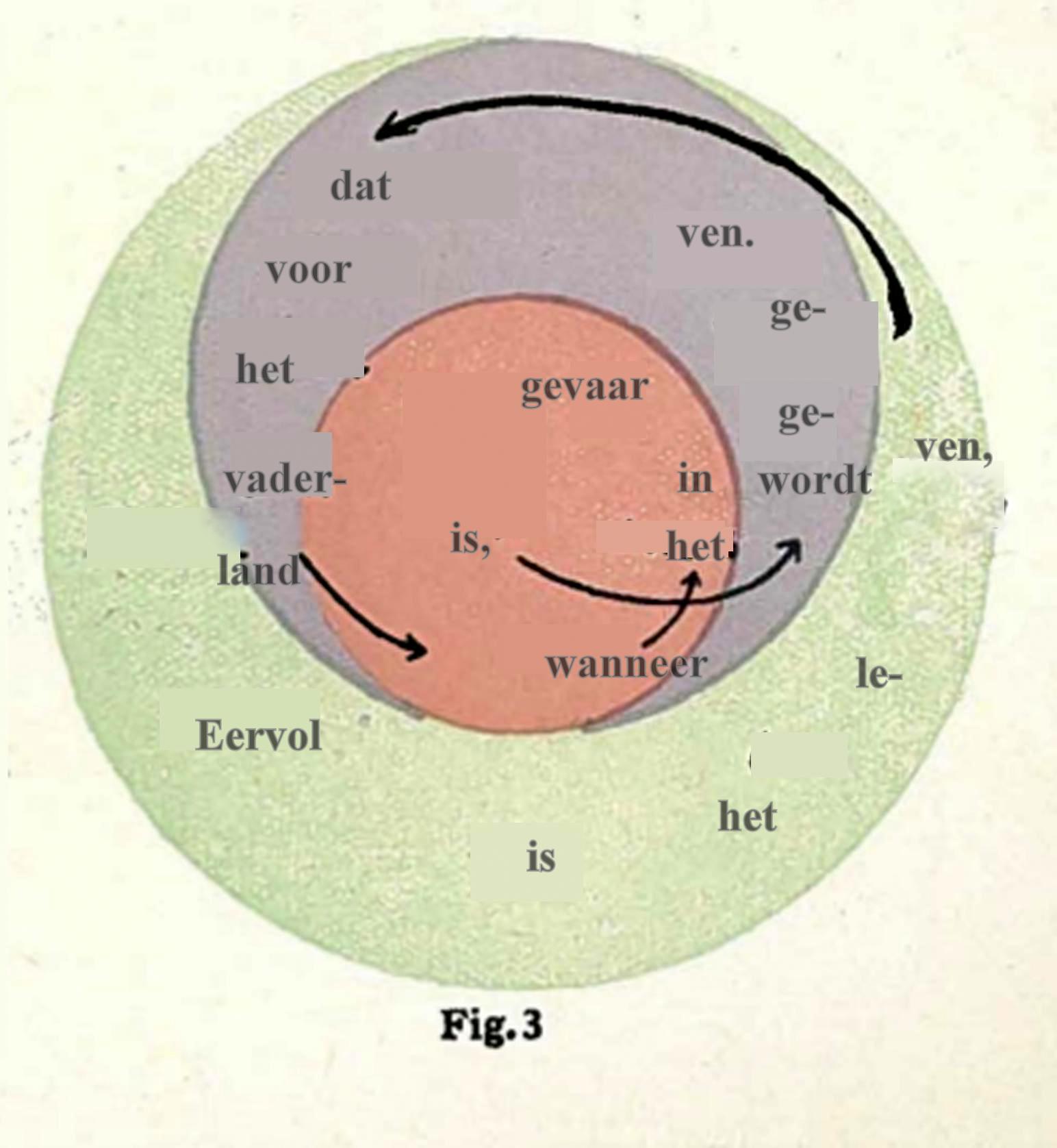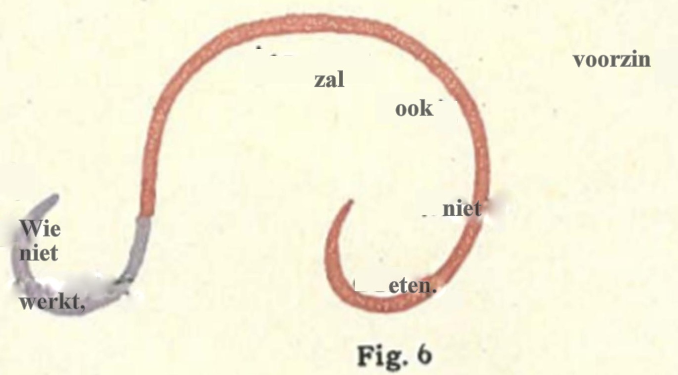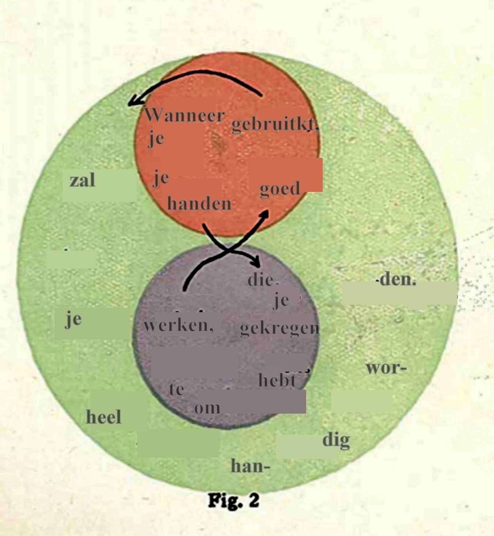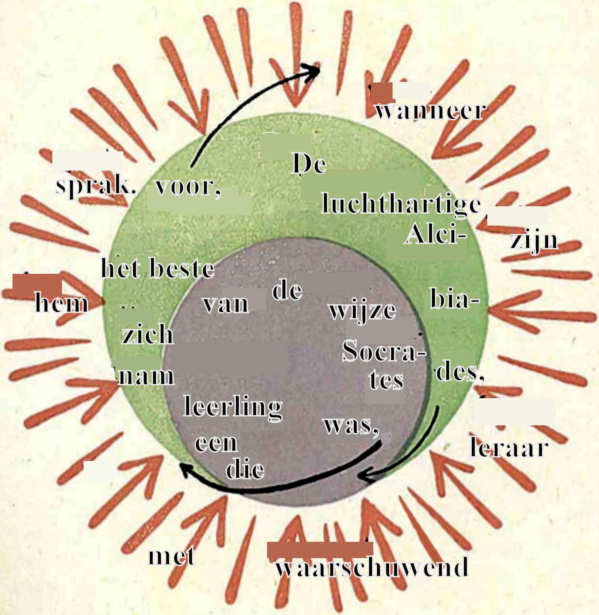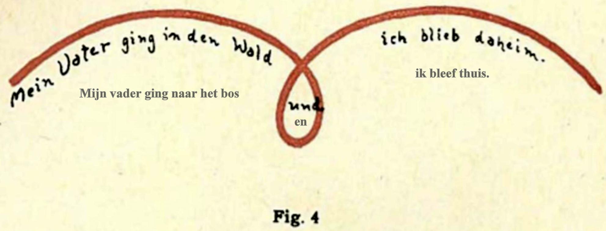 Daarover zei Dr. Steiner: ‘Dat kun je natuurlijk op de meest verschillende manieren voor elkaar krijgen. Je maakt van de hoofdzin een grote cirkel, de betrekkelijke bijzin wordt een kleine cirkel die misschien wat excentrisch geplaatst wordt en de voorwaardelijke bijzin, de ‘als-zin’ aanschouwelijk worden doordat je iets – laten we zeggen ‘stralen’ naar de cirkel leidt als de voorwaardelijke factoren.’