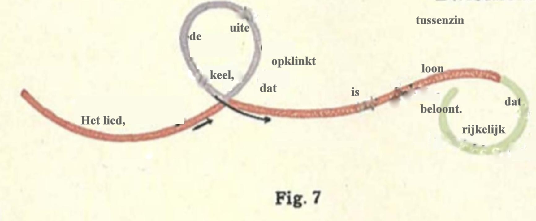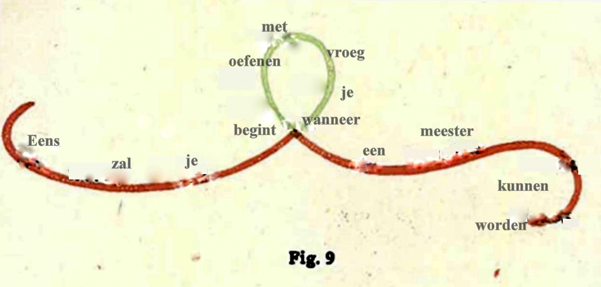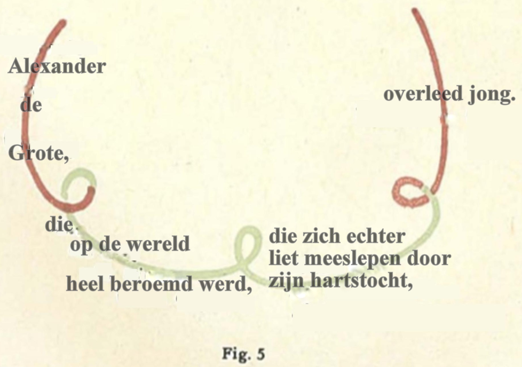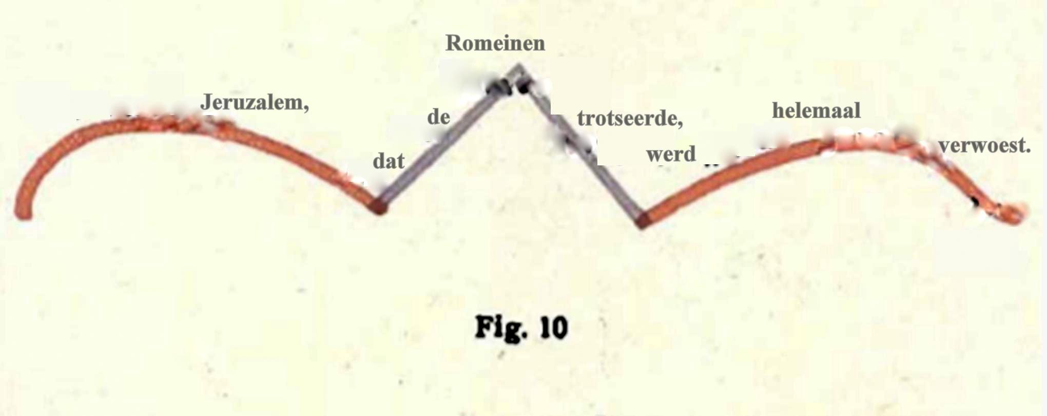 Daarover zei Dr. Steiner: ‘Dat kun je natuurlijk op de meest verschillende manieren voor elkaar krijgen. Je maakt van de hoofdzin een grote cirkel, de betrekkelijke bijzin wordt een kleine cirkel die misschien wat excentrisch geplaatst wordt en de voorwaardelijke bijzin, de ‘als-zin’ aanschouwelijk worden doordat je iets – laten we zeggen ‘stralen’ naar de cirkel leidt als de voorwaardelijke factoren.’
