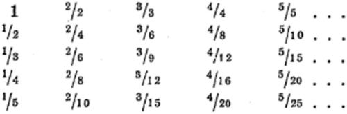 In dit verband moet nog op een ander figuur worden gewezen, dat in de oudheid voor muzikale doeleinden werd gebruikt, het zogenaamde Lambdoma-figuur, waarvan we hier echter slechts de ene helft gebruiken. Schrijf zoals in het laatste schema de eerste regel op en voeg onder elke breuk naar beneden toe de reeks van de bijbehorende breuken met dezelfde noemer, dus bijvoorbeeld onder 5/5 naar beneden toe de reeks 4/5, 3/5, 2/5, 1/5. Dan ontstaat de volgende volgorde: