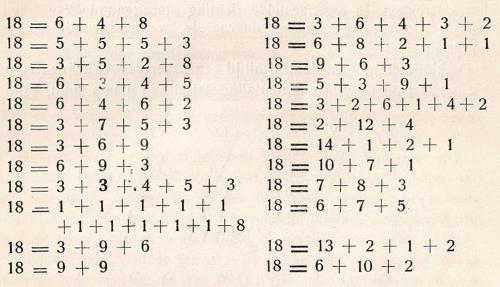 18 = 10 + 8 was zijn eerste gedachte. Die gedachte uitgewerkt; toen kwam de volgende: 18 = 9 + 9. ook deze wordt uitgewerkt. Andere hoofdgedachten volgen nog, als 18 = 6 + 6 + 6 die hier niet verder opgeschreven zijn. Enkele speelsche fantasiën als 18 = 1 + 1 + 1 + 1 enz., zijn er ingevlochten, als trillers in een muziekstuk.