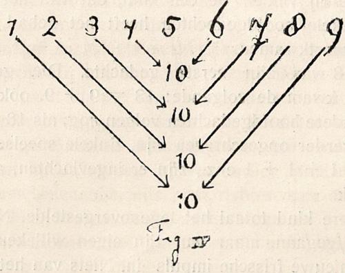 Die weg, die het kind zelf geneigd is te gaan. We moeten bij de eenheid beginnen en dan tot handeling over gaan, handeling, die tot de veelheid voert, dus deelen, verdeelen. Dat is de weg, die bij de ontwikkelingsgang van het kind aansluit.