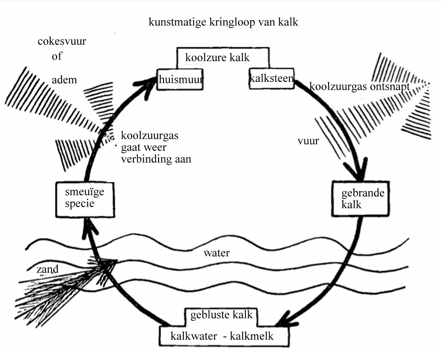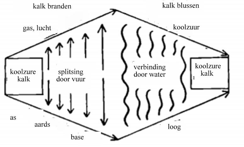 Wij pakken een stuk diepzwarte houtskool. Met water, met zuren, met basen, met lucht doet dit niets. Een inactieve stof. De gordijnen gaan dicht en wij maken een houtskoolhoopje op de tafel, we blazen extra zuurstof aan en steken de kooltjes aan. Dat is een prachtig gezicht! Eerst begint het kooltje rood te gloeien, dan geel, dan fel wit. Dat felle licht is verblindend, doet ons denken aan de zonnekrachten, die het hout gevormd hebben. Plotseling schieten roodgele vonken naar alle kanten. Een fijne proef! Grijze as blijft over en in de lucht is volop koolzuurgas ontstaan (dit tonen wij even aan met kalkwater).