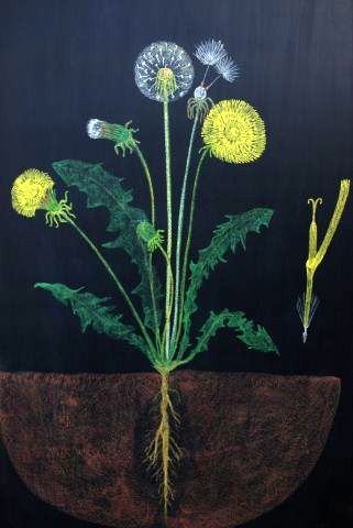 En dan is er een donkerharig meisje dat met haar penseel snel hier wat gele, daar wat roodachtige en daar weer wat blauwe kleuren neerzet. De gele maakt ze groter. Ze lijkt het heel blijmoedig te doen en ze straalt als ze op het blad wijst: ‘Een bloemenweide!’