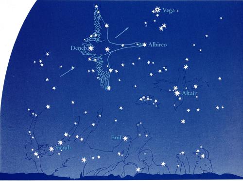 Nadat hij op het midden van de dag door zijn zuidelijke hoogtepunt heen is, neigt hij zich naar de westelijke horizon, waar hij ten slotte, eerst nog vurig rood en dan zachter violetrood, ondergaat. In de late namiddag is hij dan al milder geworden, en staat ons vervolgens toe om zijn ondergang met onze eigen ogen waar te nemen. In de daaropvolgende schemering zien we hoe de kleuren allengs verdwijnen, eerst ver van ons weg en dan steeds dichterbij. De geuren en de warmte blijven nog een tijdlang om ons heen hangen, ook als de kleuren al weg zijn. Uit het oosten nadert intussen het donker van de nacht, dat ons mee en meer omhult, terwijl we de sterren aan de hemel zien verschijnen. Die lichten op uit het donker.