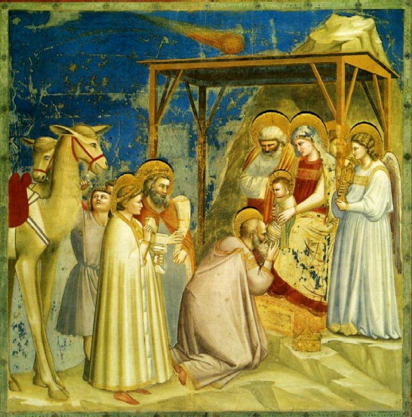 Fresco van Giotto di Bondone, 1302, Scrovegni kapel, Padua. Met de komeet en de aankomst van de Drie Koningen.