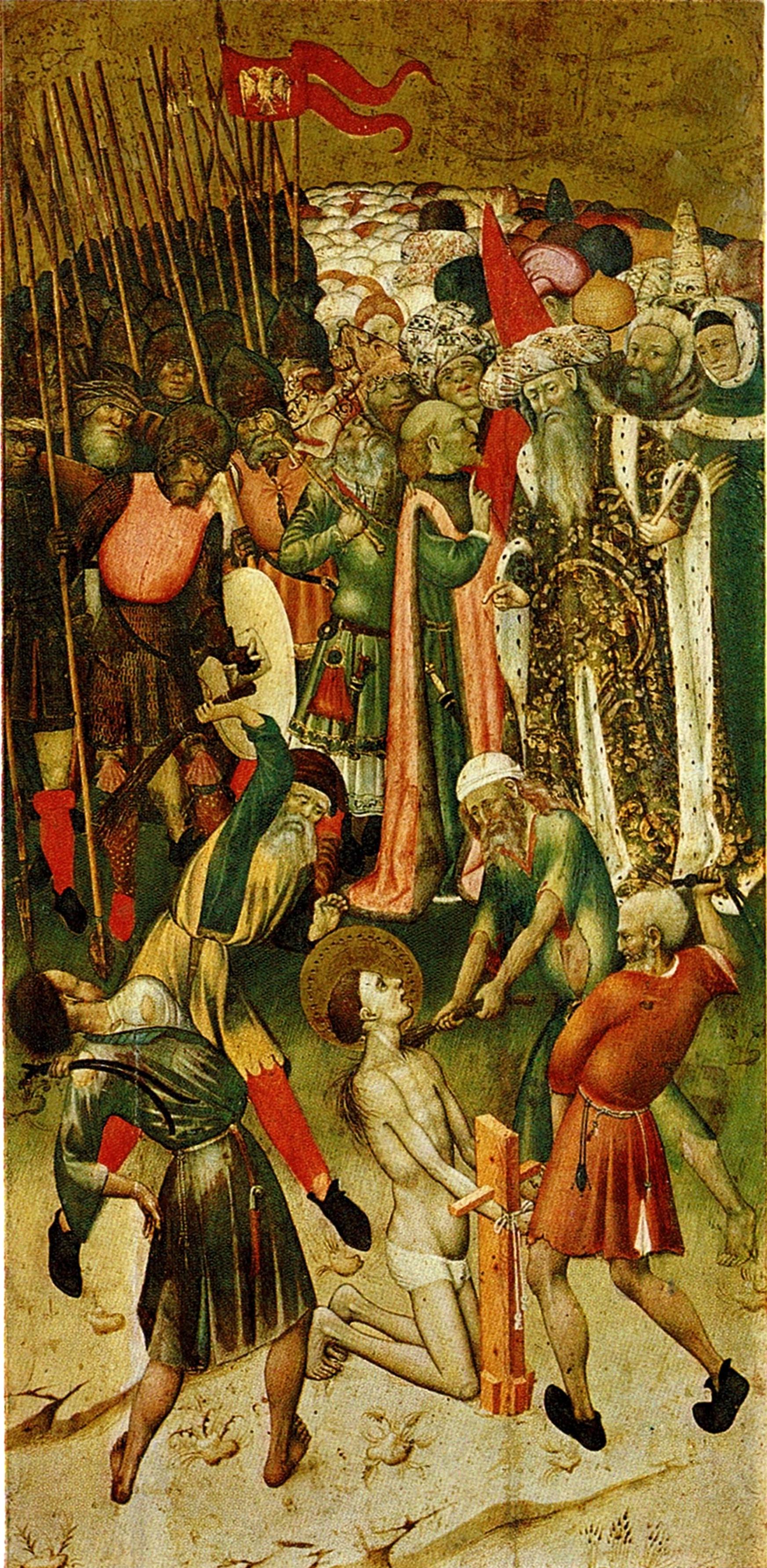 Zijn schilderij is bijzonder mooi vanwege de helderheid van de kleuren. Ook hier is de scène van de geseling een groot schouwspel geworden, maar dan wel een schouwspel voor een sensatiebelust publiek. Talloze mensen staan in de menigte hoofd aan hoofd. Links op het schilderij staart een woud van lansen ons aan. De dragers ervan hebben de grimmige gezichten van door de strijd geharde huurlingen. Rechts staat de koning, prachtig gekleed in oosterse stijl, omringd door zijn lakeien en verklikkers. Op de voorgrond, in een open ruimte, knielt Sint-Joris naakt, schaars gekleed rond de heupen, zijn handen vastgebonden aan een paal. De slagen van de flagellanten regenen neer op zijn naakte lichaam. Het zijn echt krachtige slagen, zoals duidelijk te zien is aan de gespannen houding en de grimmige gezichten van de aanvallers. Als een draaiend wiel cirkelen hun bewegingen rond de heilige. Hij knielt op zijn beurt sereen neer en heft zijn hoofd op, biddend, vervuld van de realiteit van het geloof, een monument voor zijn eigen woorden tegenover de woedende Daciër: “Mijn naam is Georgius en ik kom uit Cappadocië, van adellijke afkomst. Ik heb Palestina veroverd met de hulp van Christus. Maar ik heb alles opgegeven om God beter te kunnen dienen in de hemel.”