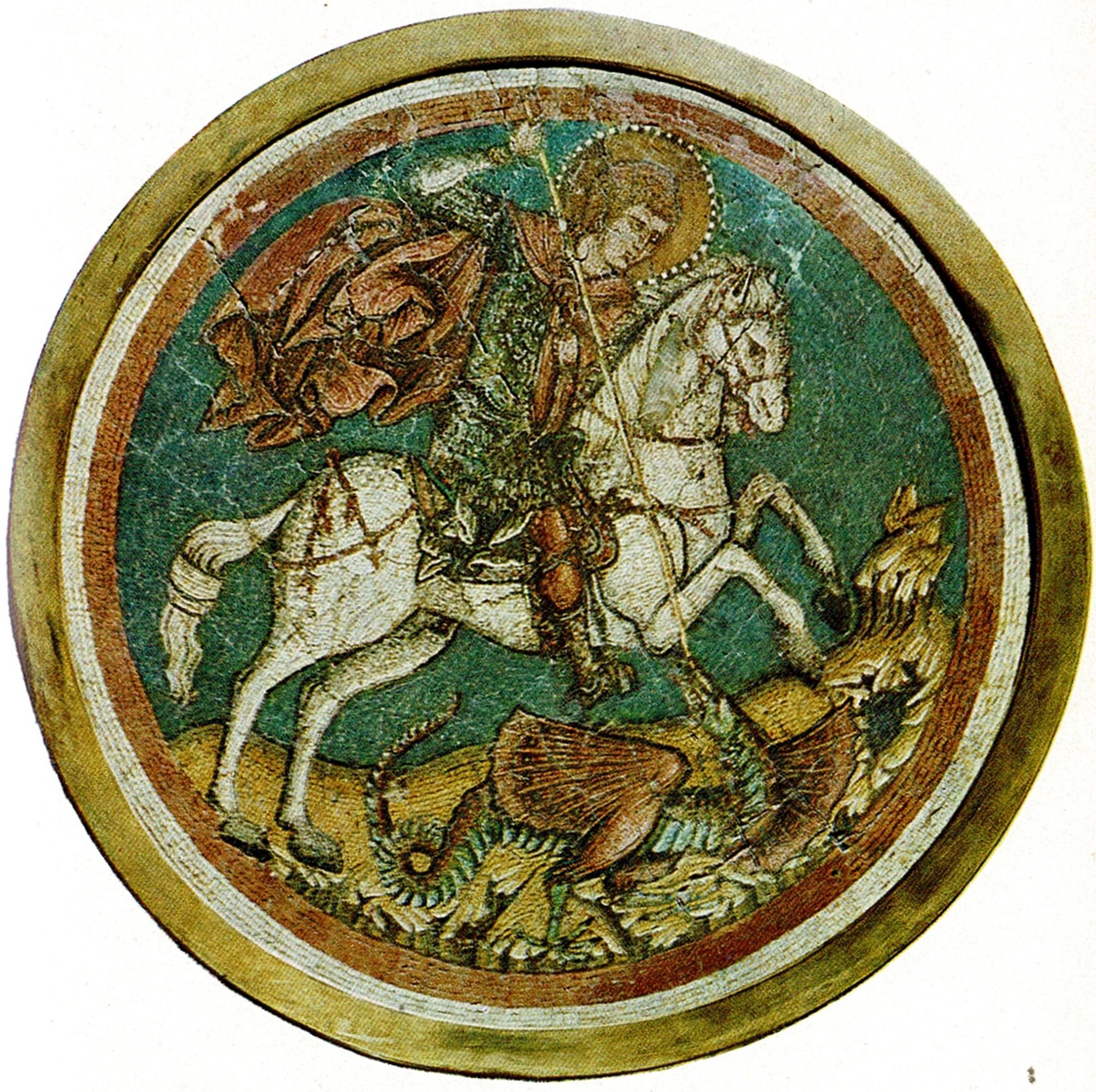 Een andere, vroegere icoon toont Georg al als drakendoder. Het is eveneens van Russische oorsprong en dateert uit de 14e eeuw.