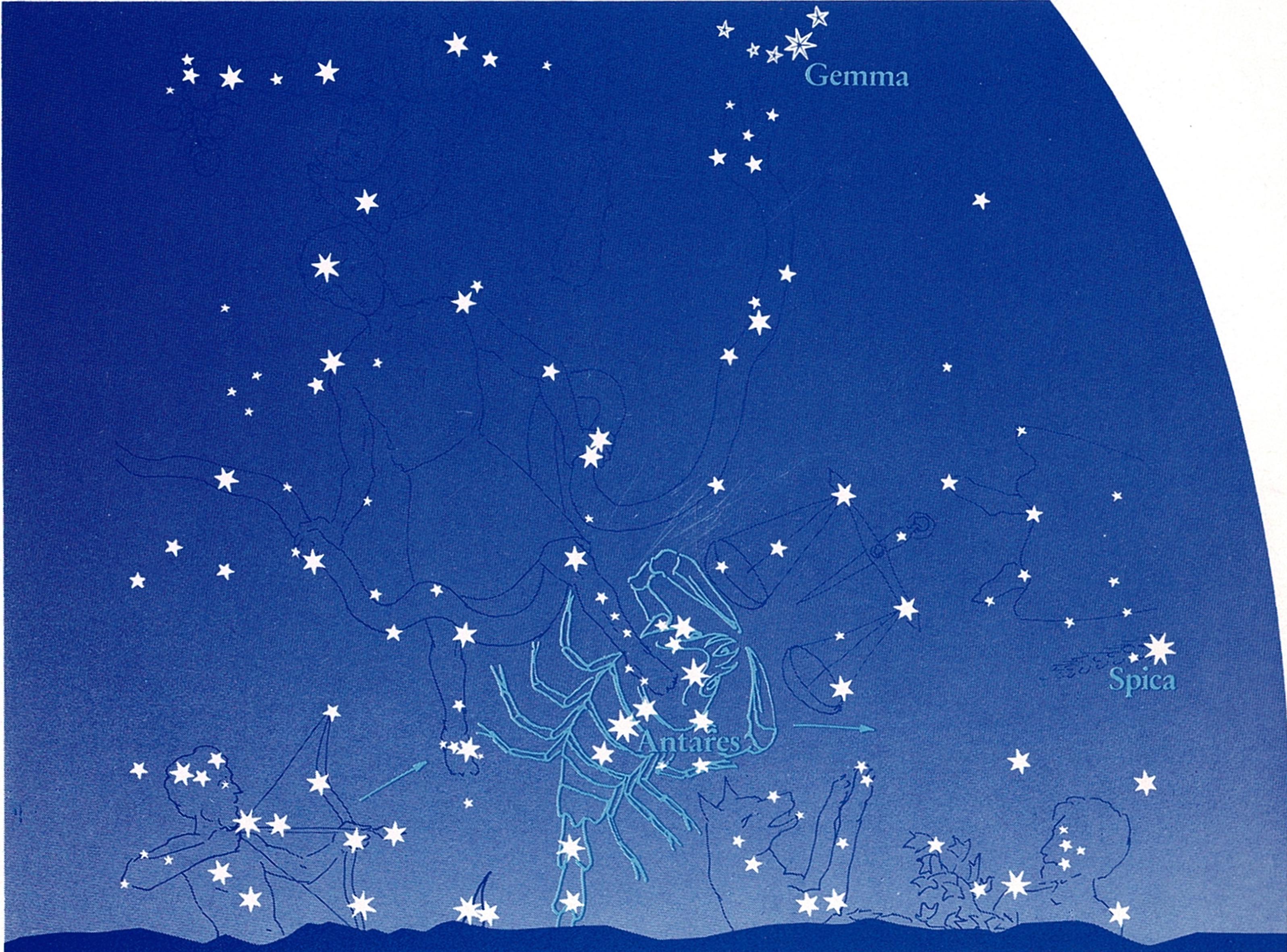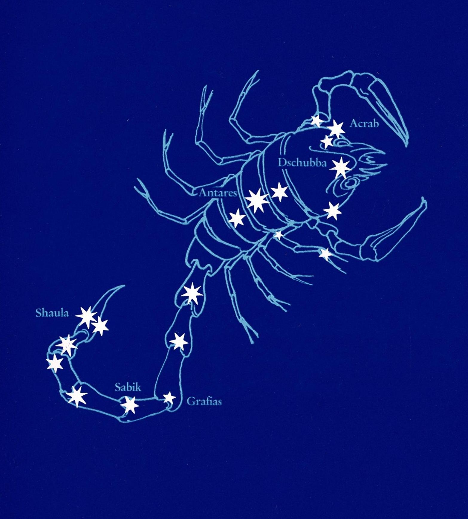Het sterrenbeeld Schorpioen hoort bij de dierenriemtekens die bij ons en verder naar het noorden maar gedeeltelijk zichtbaar zijn. In juni komt het in het zuidoosten op, bereikt in juli aan de zuidelijke hemel zijn hoogste punt (zie boven) en daalt in augustus naar het zuidwesten weer langzaam onder de horizon, dit bekeken om 22u, zomertijd.