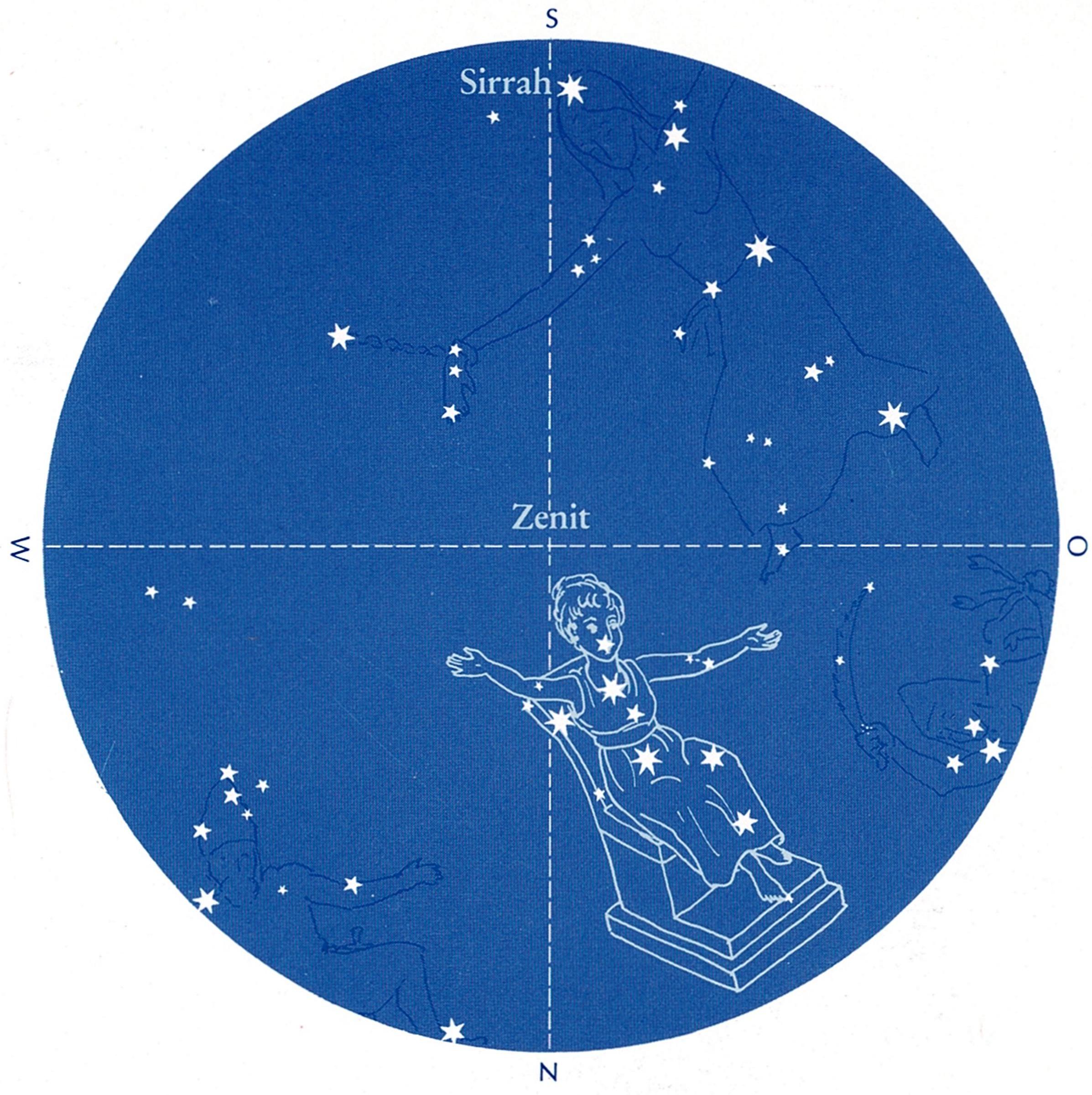We hebben geleerd ons te oriënteren, weten dat de sterrenhemel draait, dat de sterren opgaan en ondergaan, volgens hun vaste banen. Wat zien we nu aan de hemel, gericht naar de Poolster? Als hulp zijn er de oude beeldrijke verhalen, zoals onze voorvaderen ze beleefd en uitgedrukt hebben:
