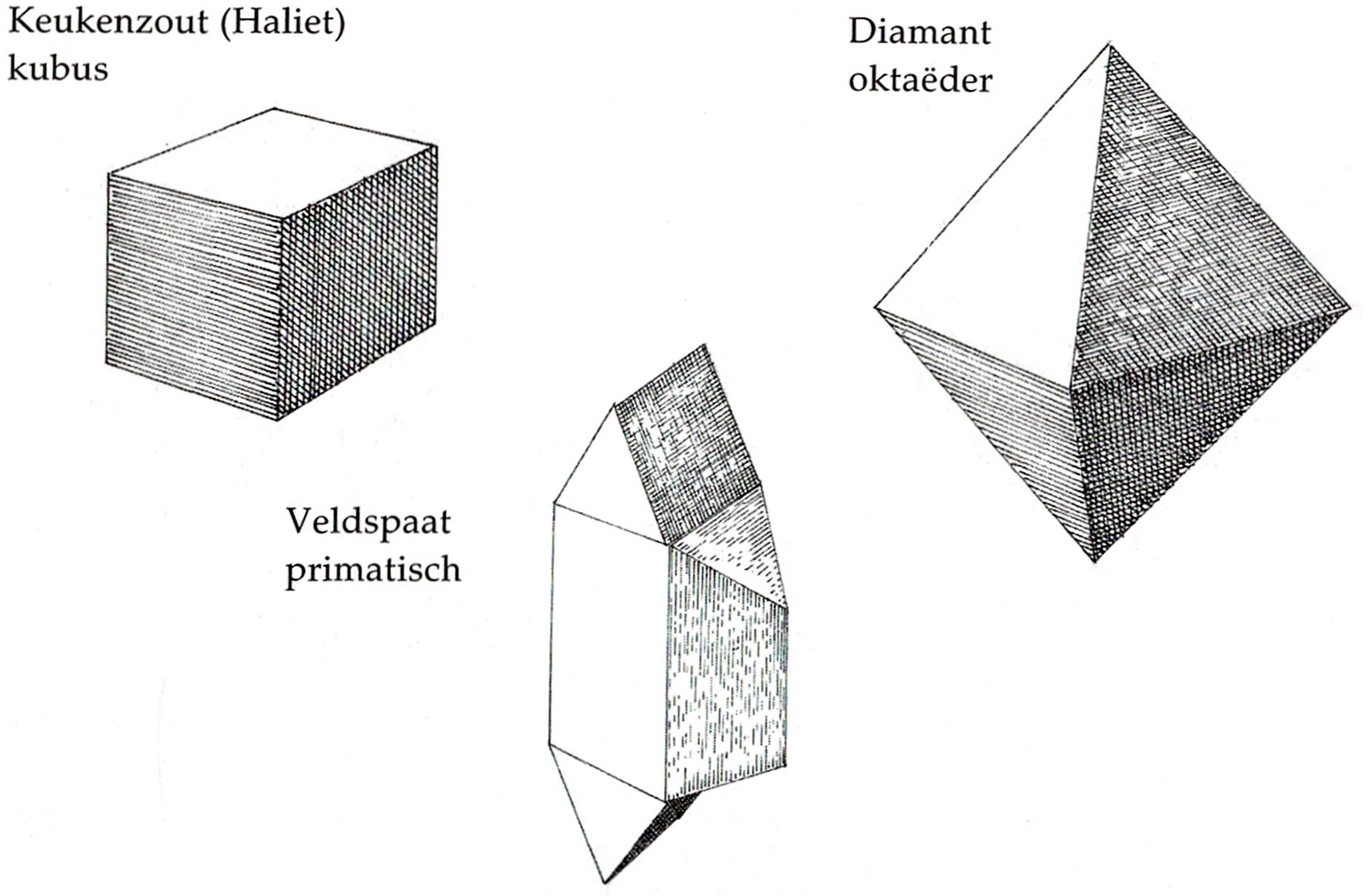 Verschillende kristalvormen worden onderzocht en getekend, waarbij de specifieke meetkundige vormen tot ordening en herkenning leiden.