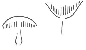 paddenstoel met een hoed en een bloemkelk. De paddenstoel is van boven afgesloten en naar beneden geopend. Hij laat zijn zaadstof naar de aarde vallen. De bloem opent zich naar boven, stuifmeel en geur worden door de met licht doorstroomde lucht gedragen