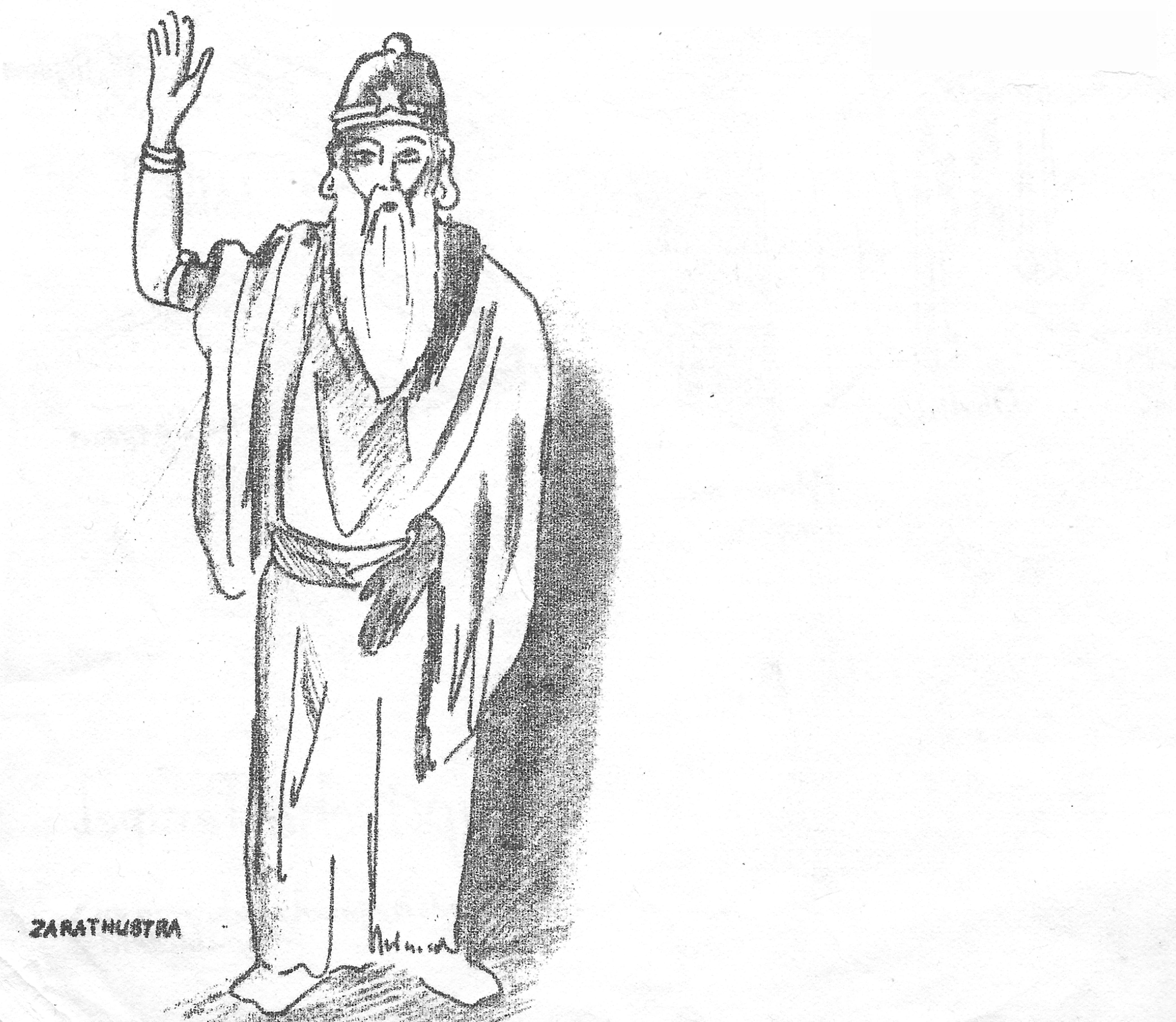 In het eerste begin was er Ahoera-Mazda, de Grote Geest uit wie alle licht voortkwam. Het licht kwam uit de Grote Geest en uit dit licht kwamen Ormoezd en Ahra-Manyu. Twee broers, maar Ahra-Manyu (Ahriman) hield niet van Ormoezd en bestreed hem waar en wanneer hij maar kon en bedierf de goede werken van Ormoezd. Daarom veroordeelde de Grote Geest Ahriman en werd hij voor drieduizend jaar naar de diepste duisternis verbannen. In de duisternis nam de haat van Ahriman jegens zijn broer alleen maar in hevigheid toe. Tenslotte bestond hij alleen nog maar uit leugen, boosheid en duisternis. Toen de drieduizend jaar verstreken waren, schiep Ahriman een groot aantal boze geesten en stuurde hen ten strijde tegen de goede geesten die Ormoezd dienden. Toen maakte Ormoezd, de Heilige Geest, een ei en vulde dat met goede geesten. Ahriman, de Verwoestende Geest, zag het en maakte eveneens een ei maar vulde het zijne met de boze geesten van leugen en boosheid. En het geschiedde dat de eieren braken en de inhoud zich verspreidde over de aarde. Naar alle uithoeken van de aarde gingen de boze en de goede geesten en zetten hun strijd voort.