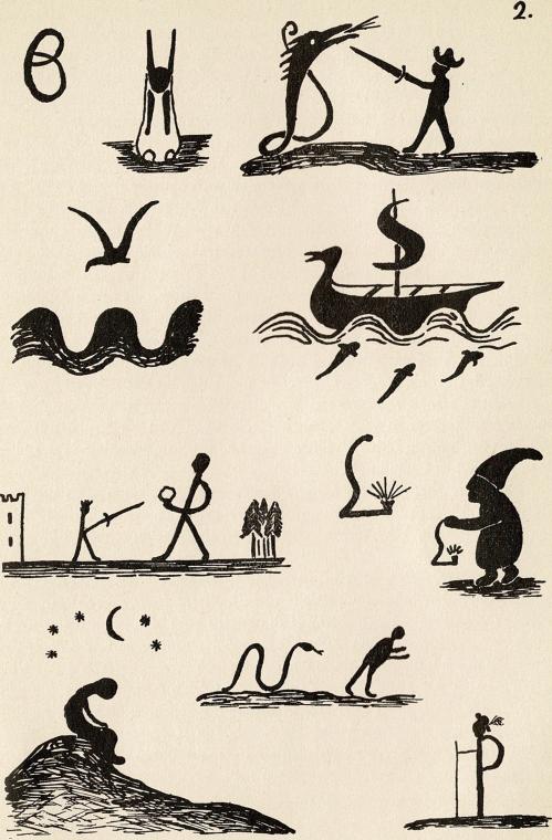 Bijzonder typische vormen heeft het intellect tot stand gebracht met de 25 letters van ons alfabet. Het zijn eveneens ook abstracte, conventioneel geworden tekens waaruit ieder leven is verdwenen.