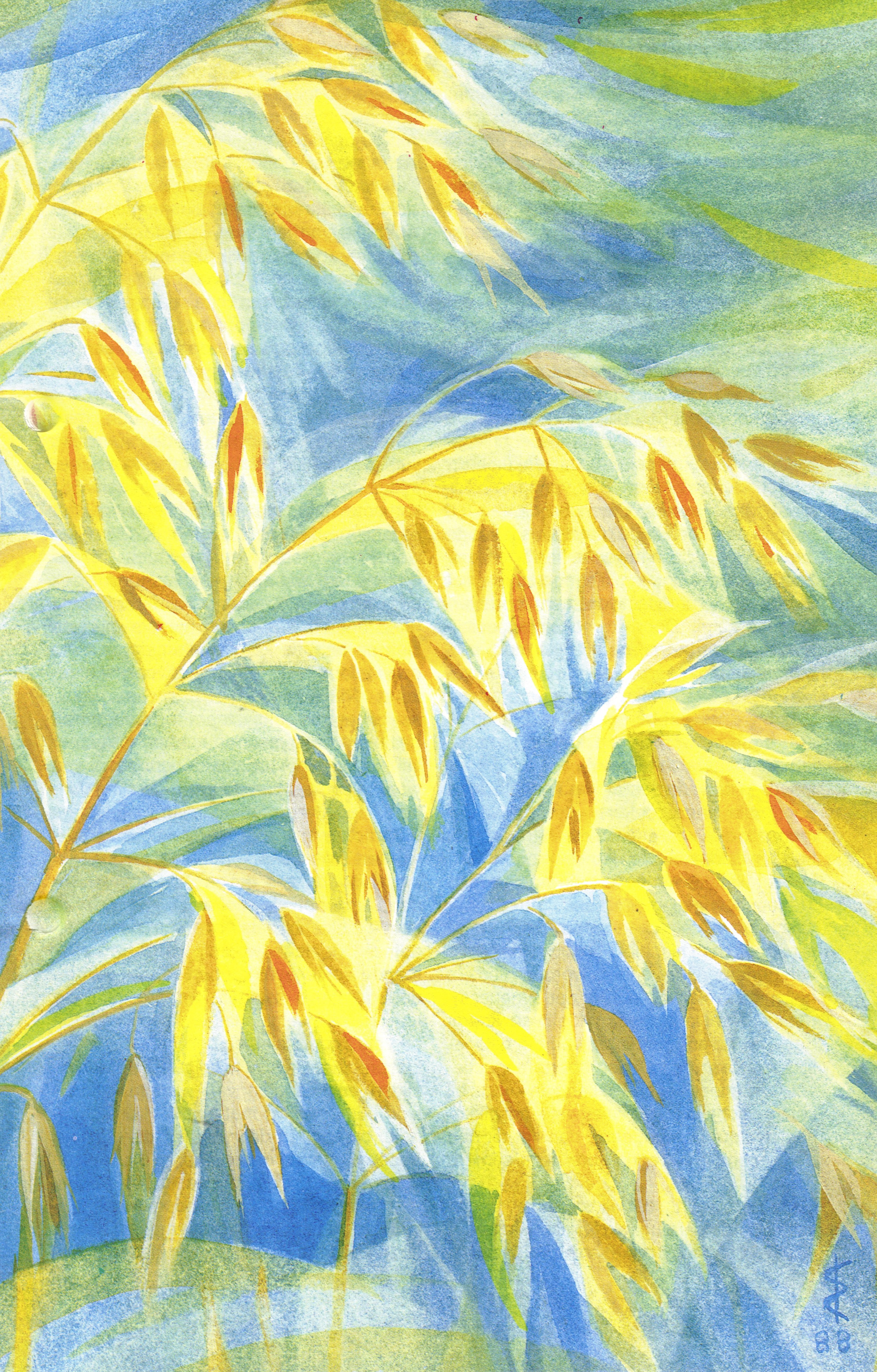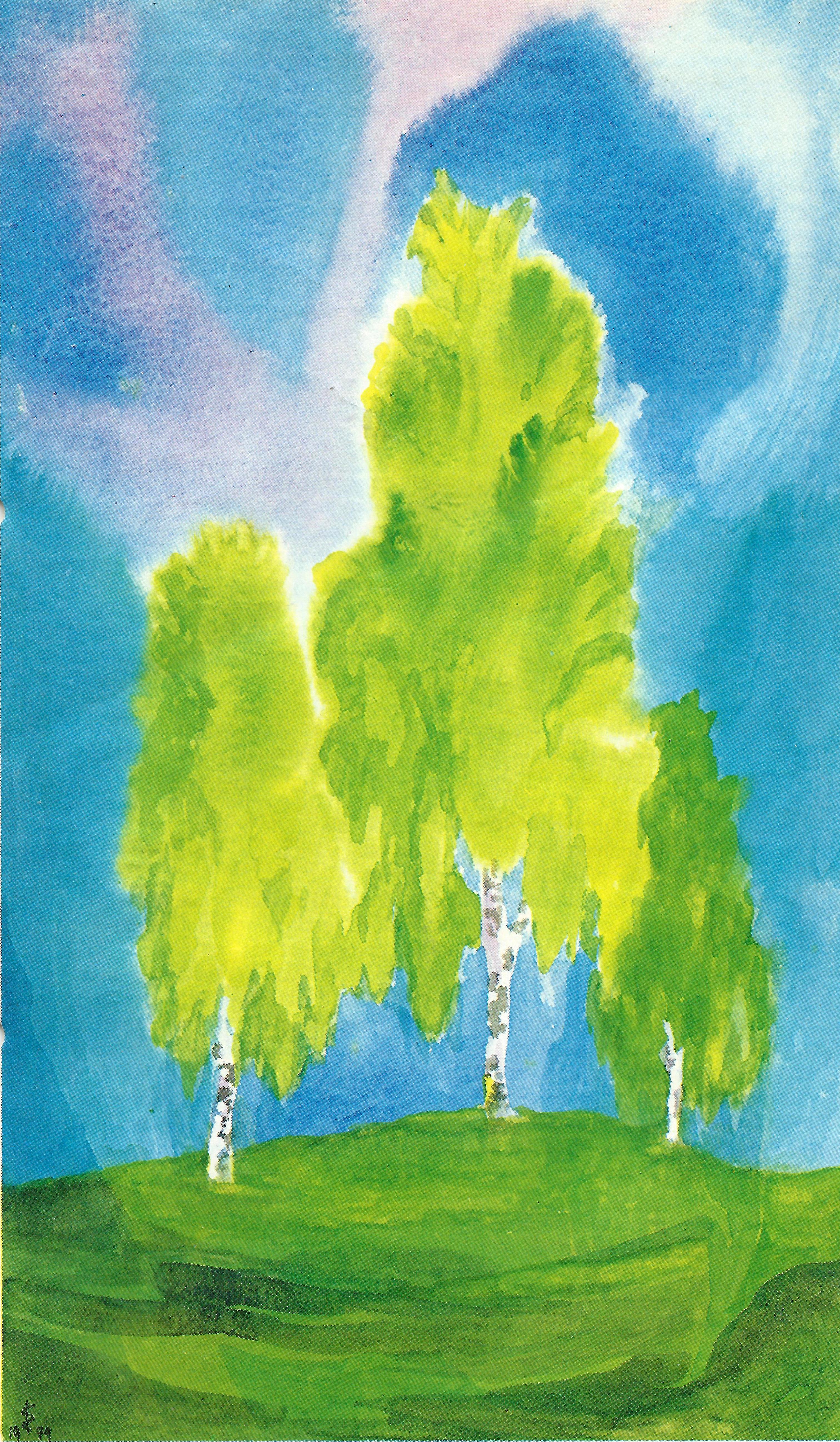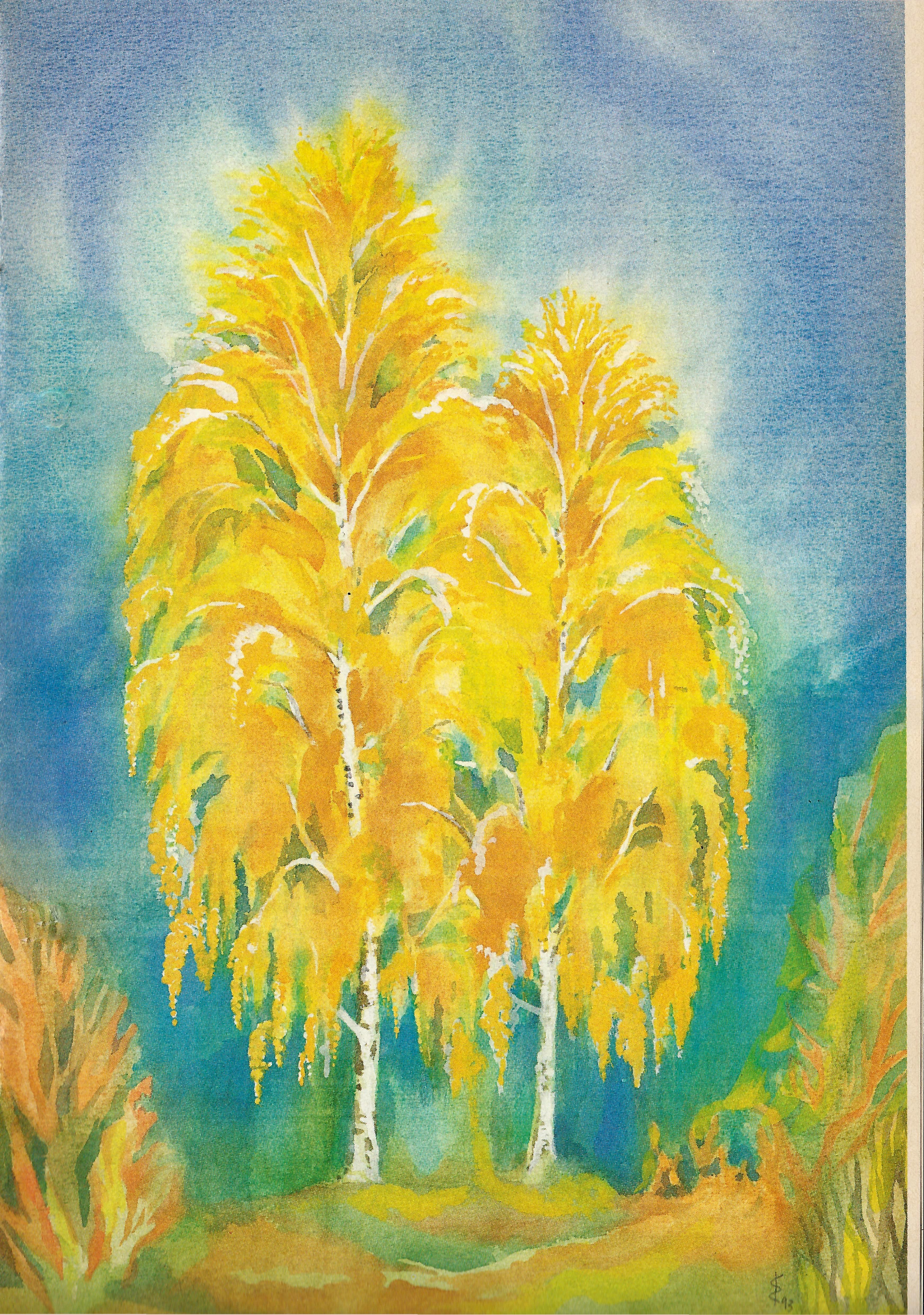 Tussen ronde met mos begroeide granietrotsen staan enkele witte recht omhoog strevende slanke berkenbomen met hun in de wind wiegende bladerkroon die van binnenuit al goud wordt nu in de late zomer. De slanke, naar boven strevende takken geven het zonlicht de kans om tot op de aarde te schijnen dicht bij de stam. Aarde en hemel worden juist door deze boom, die zo oneindig veel water in de lucht afgeeft, met elkaar verbonden. De bladeren in de toppen zijn nog groen, zij zullen het laatst afvallen. De gouden bladeren stralen vanuit het binnenste van de kroon, het licht van de zomer wegschenkend. Het oog kan kwaliteiten proeven, zoals het frisse groen van het berkenblad, of het geel van de totale berkengestalte, dat straalt als licht. De omgeving van de berk heeft iets vrolijks, wat men als lichtrood kan ervaren. Het gebaar in zijn geheel is warm blozend, men voelt zich opgeheven en perifeer gehouden. Recht en strevend, maar heel levend, niet streng, verschijnt de boom; het oog tast en voelt een harde kwaliteit.
