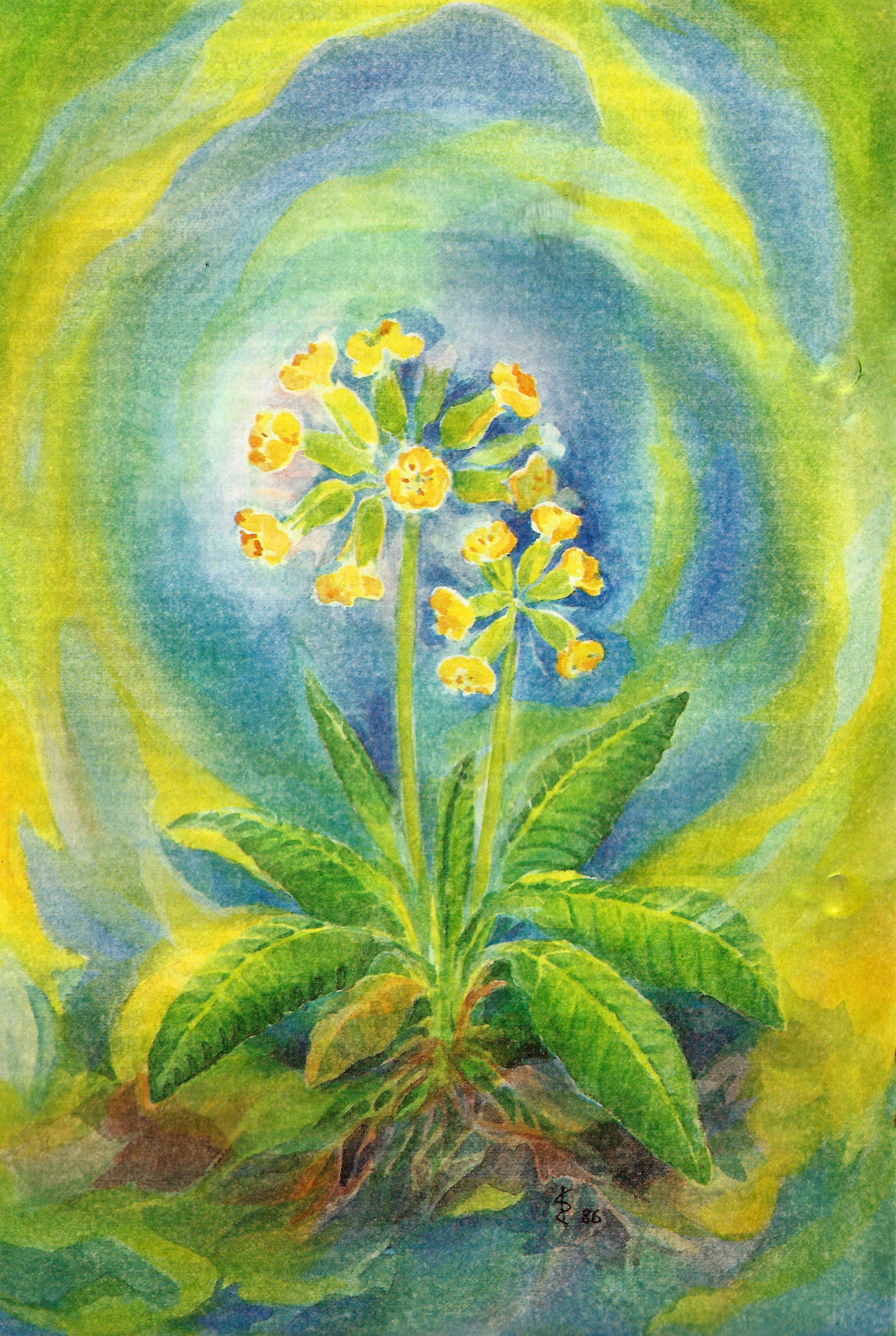 De sleutelbloem (Primula veris). Zodra de zon in het voorjaar de nog vochtige bodem verwarmt, kan men in het bruine verdorde gras, langs de kant van de weg en aan de zonkant van heggen en struiken de eerste sleutelbloemen (Primula vut is) ontdekken. Ze hebben een sterkere gele kleur dan de nauw verwante hoge sleutelbloem (Primula eliator). Deze is niet zo van het licht afhankelijk; zij komt meer in elzenbosjes en langs beken voor. Vlak tegen de grond gedrukt, ten dele verborgen in de reeds in aanleg aanwezige bladrozet, hebben de bloemknoppen de hele winter gerust. Zij ontplooien zich nu heel vlug en, worden daarbij door de snel groeiende steel omhoog gedreven. Als men nauwkeuriger toeziet krijgt men de indruk, dat de bloei bij de Primula op een eigenaardige manier zelfstandig is geworden. Los van de normale plantaardige ontwikkeling – die eerst tot de ontplooïng van de groene plant leidt – snelt hier het bloeiproces zonder relatie met het overige gebeuren vooruit. Reeds op de grond beginnend, door de bladloze steel snel en ver van de nog onontplooide bladeren verwijderd, verloopt het bloeien volgens eigen wetten. Talloze vroeg vliegende vliesvleugeligen en vlinders bezoeken de licht geurende klokbloemen, die afzonderlijk minder opvallend dan bij andere Primulasoorten, hoofdzakelijk door hun aantal opvallen. De bloei is spoedig voorbij. Opvallend is, dat de bladeren en zelfs de vruchtstelen hun groei tot aan de rijping van de nu niet meer hangende, maar rechtopstaande zaaddozen voortzetten en daarbij een veelvoud van hun grootte ten tijde van de bloei bereiken. Na een rustpoos in de zomer ontstaat in de herfst, als de grond weer vochtiger wordt, uit de solide basis van een korte wortelstok en van lange, sterke wortels een nieuwe bladrozet met de aanleg van bloemen voor het komende voorjaar.