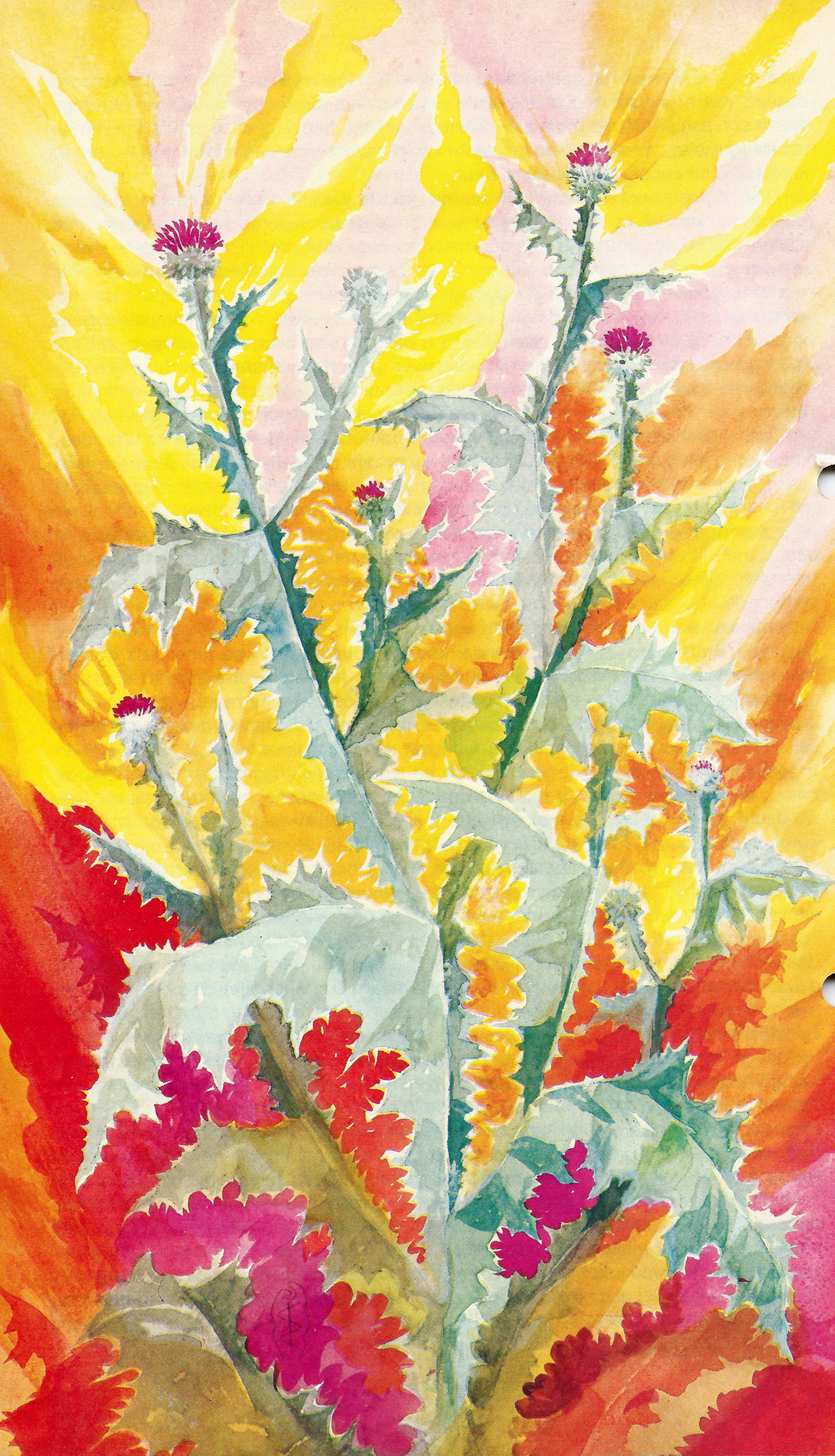 Wegdistel De meest indrukwekkende, machtigste van alle distels is de wegdistel (Onopordon Acanthium). In onze streken wordt hij slechts sporadisch aangetroffen; hij komt meer voor in gebieden met droge, warme zomers. Toch is hij tot in Schotland en Scandinavië en ook in het Midden-Oosten verspreid. Uit de dikwijls pas na jarenlange rust ontkiemende zaden ontstaat boven de grond in het eerste jaar een geweldige, soms één meter grote rozet van brede, doornachtige, getande bladeren, terwijl een krachtige penwortel zich diep de steenachtige grond inboort. In het begin van de zomer van het tweede jaar ontplooit zich in slechts enkele weken de imponerende verschijning van de bloeiende plant, meer dan manshoog en door vertakking dikwijls met een omvang van enkele meters. In een fraaie metamorfose worden de rozetbladeren mee omhoog gevoerd, die daarbij naar boventoe steeds meer met de stengel samensmelten en tenslotte een brede, met stekels omzoomde vleugelvorm vertonen. De talloze vertakkingen dragen elk één of meer purper-violette, stekelige bloemhoofden, die door bijen, hommels en vlinders ijverig worden bezocht De indrukwekkende verschijning van deze meestal zilvergrijze grote distel krijgt nog een extra reliëf doordat hij bij voorkeur groeit op vrije, niet door andere plantengroei belemmerde plaatsen. Hij maakt een verbazingwekkend harmonische en uitgebalanceerde indruk. Het evenwicht tussen straalvormig zich uitstrekken en de uitbreiding in grote uitgespreide bladgedeelten, de verbinding van beide aan elkaar tegengestelde gestes door het overvloedig optreden van stekels aan de ene kant, en het vleugelvormig uitstrekken van de stengels aan de andere kant — dit alles is hier op een bijzonder fraaie wijze gelukt. Hierin ligt de ‘adeldom’ die ondanks haar dikwijls woeste, verlaten standplaatsen kenmerkend is voor deze plant. Men vindt beschrijvingen van de wegdistel al in de oudste kruidenboeken. Behalve als vezelplant en als groente werd hij als medicament vooral uitwendig bij talloze huidziekten toegepast. Een geheel nieuwe indicatie is de door Rudolf Steiner geïnaugureerde verwerking van de bloemen van de wegdistel, samen met primulabloemen en bilzekruid tot een genees- en harmoniseringsmiddel voor het uit zijn evenwicht geraakte hart.