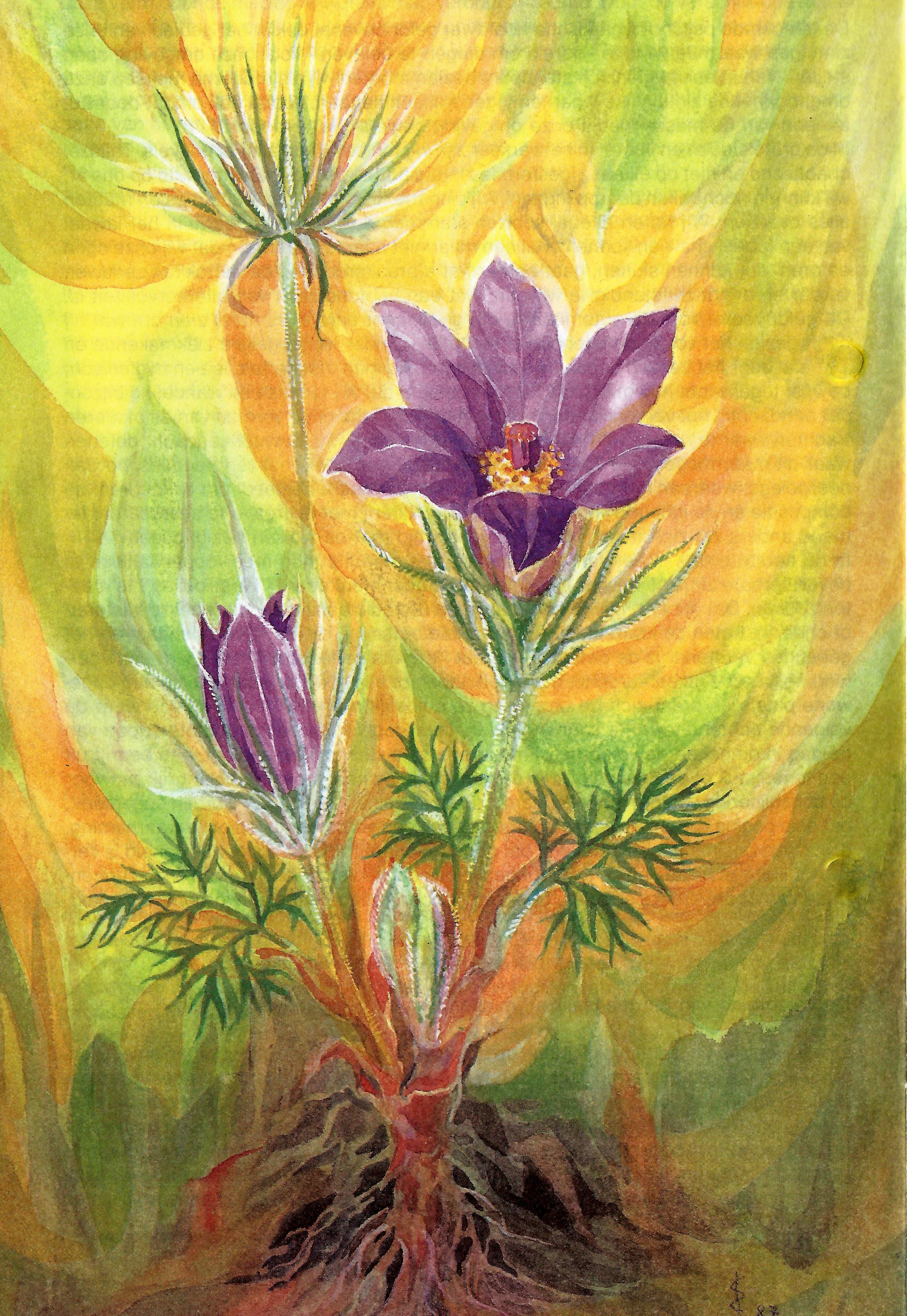 Wildemanskruid (Pulsatilla vulgaris) Vroeg in het voorjaar, als op zonnige plekken de grond wat warmer is geworden, gaan midden in het dichte nest van dorre bladeren en zilverig behaarde, nog niet tot ontwikkeling gekomen nieuwe blaadjes plotseling en altijd weer verassend de kelken van het wildemanskruid open. De purperviolette bloemen vertonen een sterk contrast met de vele gele meeldraden.