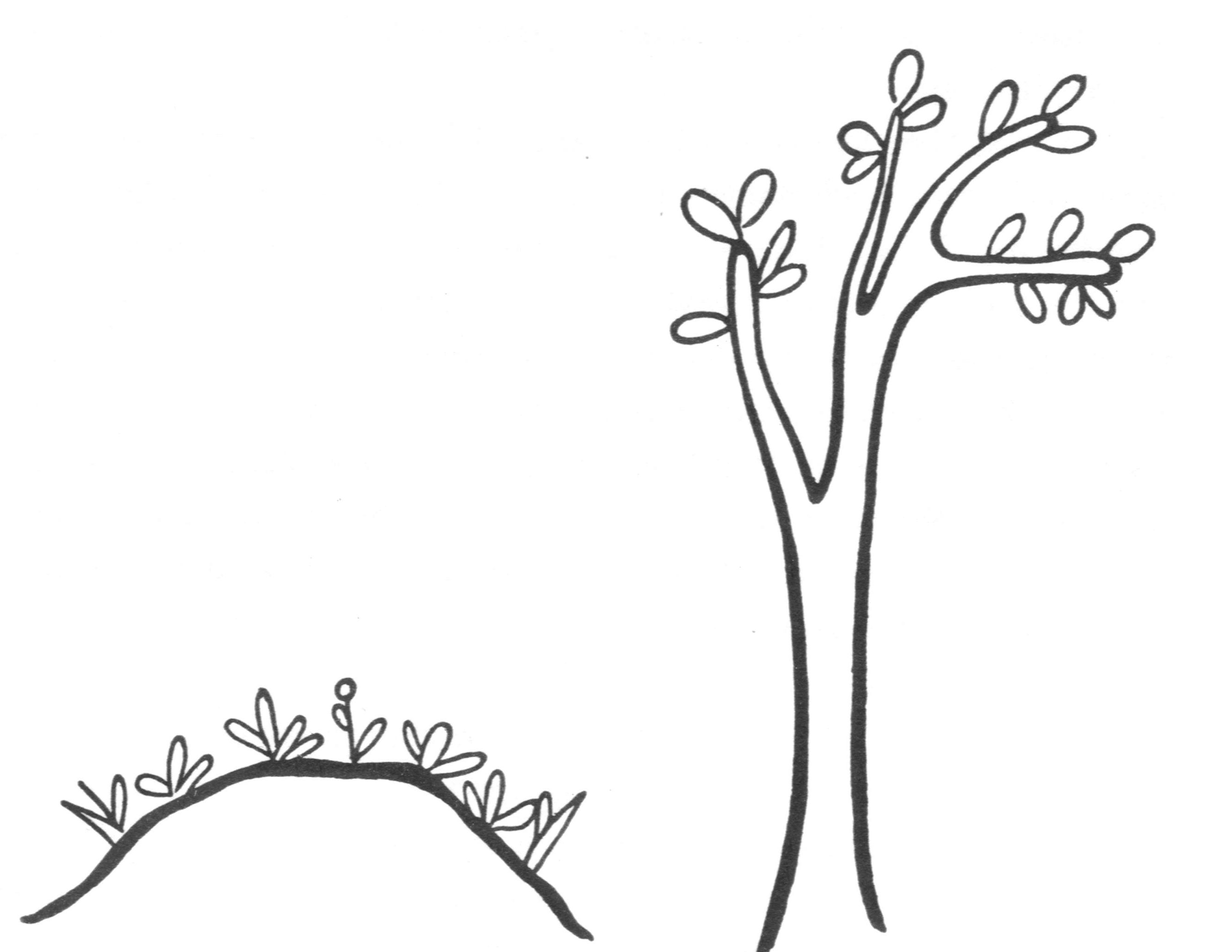 ‘Kijk eens goed naar een boterbloem, of een andere bloem die we uit kunnen graven. Onderaan zie je de wortels, dan de stengel, de bladeren, de bloemen en dan de meeldraden en de stamper, waaruit de vrucht wordt voortgebracht.’ Zo’n plant laat men de kinderen ook in het echt zien. Dan gaat men met de kinderen naar een boom: ‘Kijk eens, stel je die plant eens voor naast deze boom! Hoe ziet deze boom er dan uit? Ja, hij heeft onderaan ook wortels, zeker, maar dan is er geen stengel, maar een stam. Dan spreidt hij eerst nog zijn takkenuit en dan lijkt het wel of op die takken pas de eigenlijke planten groeien. Want op die takken zitten veel blaadjes en bloemen. Er groeien als het ware kleine plantjes op die takken. We kunnen een weiland dan ook heel anders zien: over de hele wei groeien van die gele boterbloemen. De wei is bedekt met planten die allemaal hun wortels in de aarde hebben. Maar bij een boom is het alsof men de wei heeft opgepakt, omhooggetild en rond gebogen, zodat al die bloemen pas daar bovenop groeien. De stam is zelf een stuk aarde. De boom is hetzelfde als de wei, waarop de planten groeien.