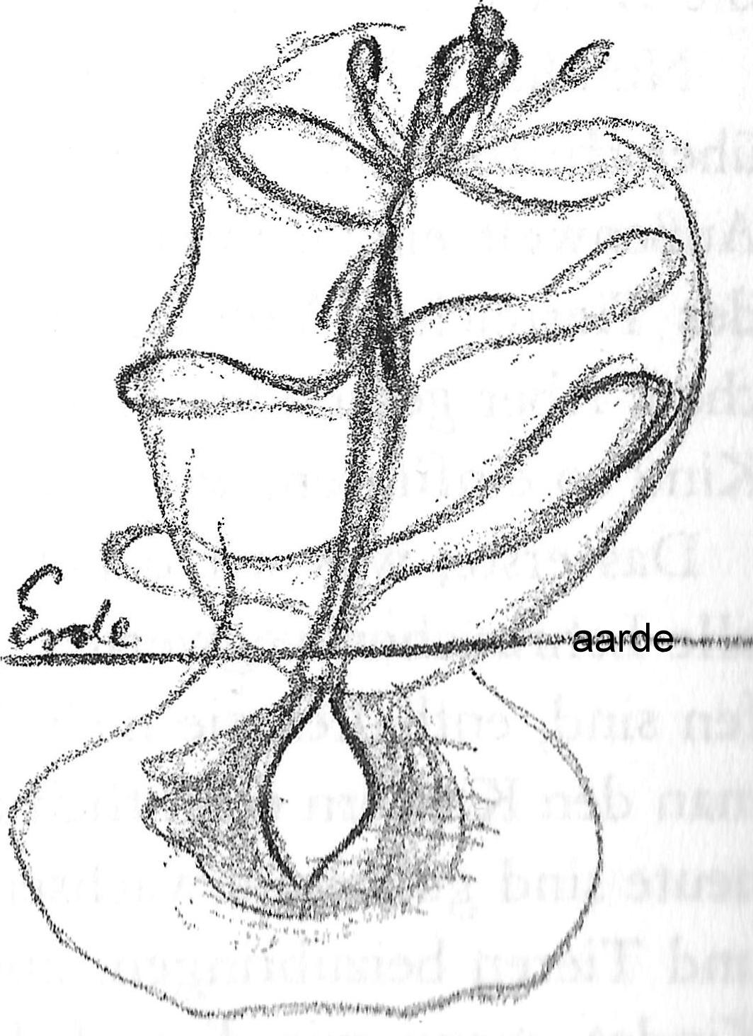 En nu stellen we ons het verhaal weer heel anders voor: dat de plant alles onder de aarde houdt. Ze wil wortels ontplooien, maar komt er niet toe. Ze wil bladeren ontvouwen, maar krijgt het niet voor elkaar. Alleen dat daar boven, dat wat anders in de bloem zit, ontvouwt zich: dan ontstaat er een paddenstoel. En als dan ook de wortels daaronder mislukken en er alleen maar bladeren ontstaan, dan ontstaan er varens. Dat zijn allemaal verschillende vormen, maar het zijn allemaal planten.’