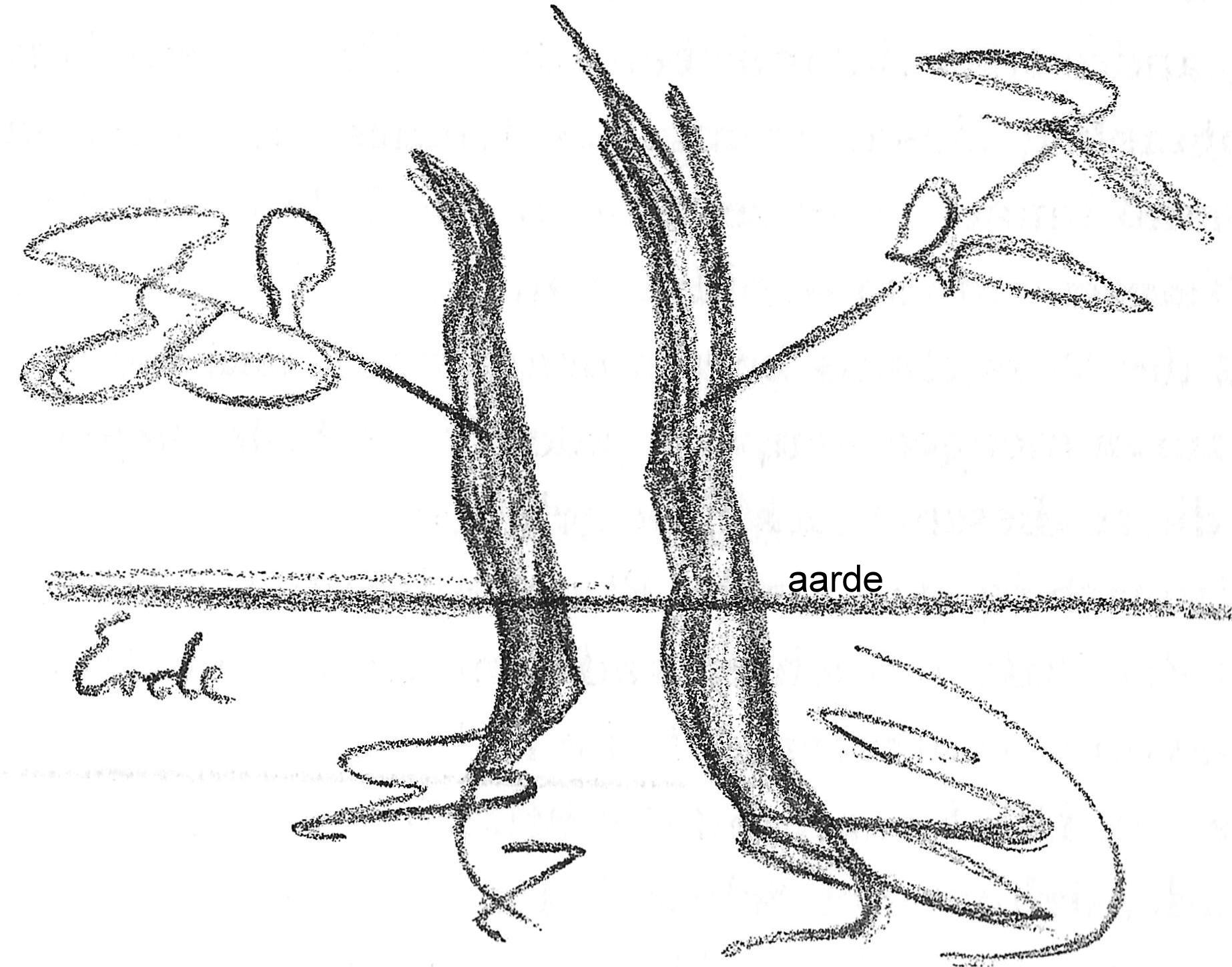 Hier hebben we dus het eerste beeld van deze werkbespreking! Rudolf Steiner maakt geen onderscheid tussen boomstam en groene stengel. Dit onderscheiden is niet alleen feitelijk nodig, maar speelt ook pedagogisch-methodisch een belangrijke rol, omdat later de begrippen ‘omhoog gegroeide aarde’, ‘uitwassen van de aarde’ voor boomstammen uitgewerkt moeten worden. Wanneer de aarde het voor elkaar krijgt zich omhoog te werken en levende, of half levende heuveltjes op te werpen, moet zij zelf levend zijn. Het hout van de boom is rotssteen op vegetatief niveau. Wanneer het bij zeer oude wilgen, linden of eiken vermolmt, wordt dat een soort aarde, ‘boomaarde’, precies zoals gesteente tot aarde kan verweren. De groene plantenstengel daarentegen, hoort niet bij het aardse. Die is een onderdeel van de eigenlijke plant die blaadjes, bloemen en vruchten draagt en alleen kan worden begrepen als resultaat van gestalte scheppende etherische kracht rondom de aarde. Het weefsel van het cambium van de bomen dat het hout en de bast van de boom opbouwt, streeft naar een zo snel mogelijke verdichting, zelfs mineralisering, zonder daarvoor tijd te hebben gehad een echte plant te worden. Je zou het cambium het levende orgaan van de aarde kunnen noemen binnen de plant, waardoor de aarde haar recht laat gelden. Is dus de tendens als eigenschap van een boomstam duidelijk door het aardse bepaald, zo is aan de groene plant alles tegengesteld aan het aardse. Groeirichting, vorm en stofvorming worden alle door de kosmos bepaald. De boom heeft de stengelachtige gestalte van zijn takken en twijgen (vooral de jonge) en de zuilenvorm van de stam slechts a.h.w. van de stengel ‘geleend’, want de processen van hout- en bast(schors)vorming leunen aan tegen die van de stengel. Wanneer we met de kinderen over de rol van de aarde bij de vorming van bomen spreken, zullen we waarschijnlijk de beschouwingen van hierboven niet nodig hebben, omdat kinderen beelden zoals deze onmiddellijk begrijpen. Voor de volwassene is het echter goed, ook de natuurwetenschappelijke grondslagen te doordenken.[2] [zie Grohmann: leesboek voor de plantkunde – over de bomen]