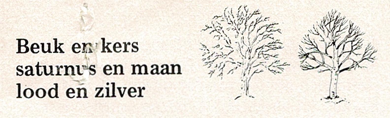 Wanneer we ons het beeld voor ogen stellen van de in de meimaand bloeiende kersenboom, dan laat dit de indruk na van leven, van uitbundig leven en licht. Dit wordt in extenso beleefd bij de aanblik van een kersenboomgaard. Voordat de bladeren zich ontplooien verschijnt de bloesem, wit en transparant. Rond die bloesem dartelen duizenden insecten die daarmee het element ‘leven’ onderstrepen. Als we het beeld van een bloeiende kersenboomgaard laten overgaan in dat van een beukenbos, dan krijgen we een gevoel van somberheid, van verstarring en dood. Onder de beukenbomen groeit vrijwel niets. Een beukenboom is een hoogst asociaal schepsel, wat we bij het uitbotten kunnen waarnemen: terwijl sommige exemplaren al groene bladeren krijgen, zijn anderen nog in pure wintertooi. Ook per boom is dat verschil waar te nemen: hier en daar een tak met jong gebladerte, terwijl andere takken er nog niet over denken hun bladeren te ontvouwen. Ja, de beuk is een heel eigenzinnige boom! Als we met één woord het karakter van de beuk zouden willen uitdrukken, dan komt ons allereerst het woord ‘ernst’ in gedachte. Ernstig en majestueus staat hij daar, de beuk, zelfs een beetje ongenaakbaar. De kers daarentegen komt ons (en de vogels) tegemoet met z’n sappige vruchten.