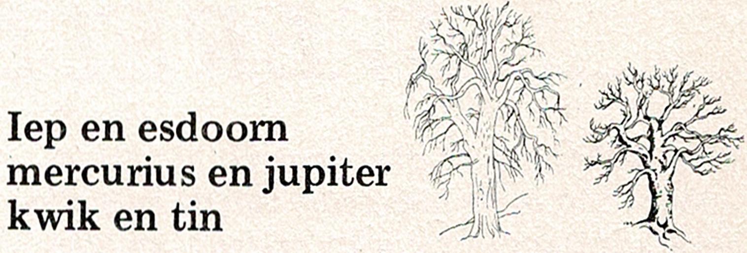 Intellectueel gesproken waren het vooral de voordrachten van Fritz Julius [2](Bomen en planeten) en Leen Mees [3] (Levende metalen) die veel hebben bijgedragen tot onderstaande beschouwingen. In religieuze zin zijn dat de Baumwochensprüche van Johannes Hemleben [4], voortkomend in Symbole der Schöpfung. Die boomspreuken spinnen onzichtbare draden tussen bovenstaande gebieden en de kern van ons wezen. Ze wekken ons op om ons bezig te houden met spirituele inhouden. Laten we een en ander wat nader bekijken. Uiteraard kunnen in dit korte bestek slechts enkele gezichtspunten worden behandeld. Het wordt een boeiend spel wanneer de lezer via z’n eigen waarnemingen en denken nieuwe visies kan toevoegen.