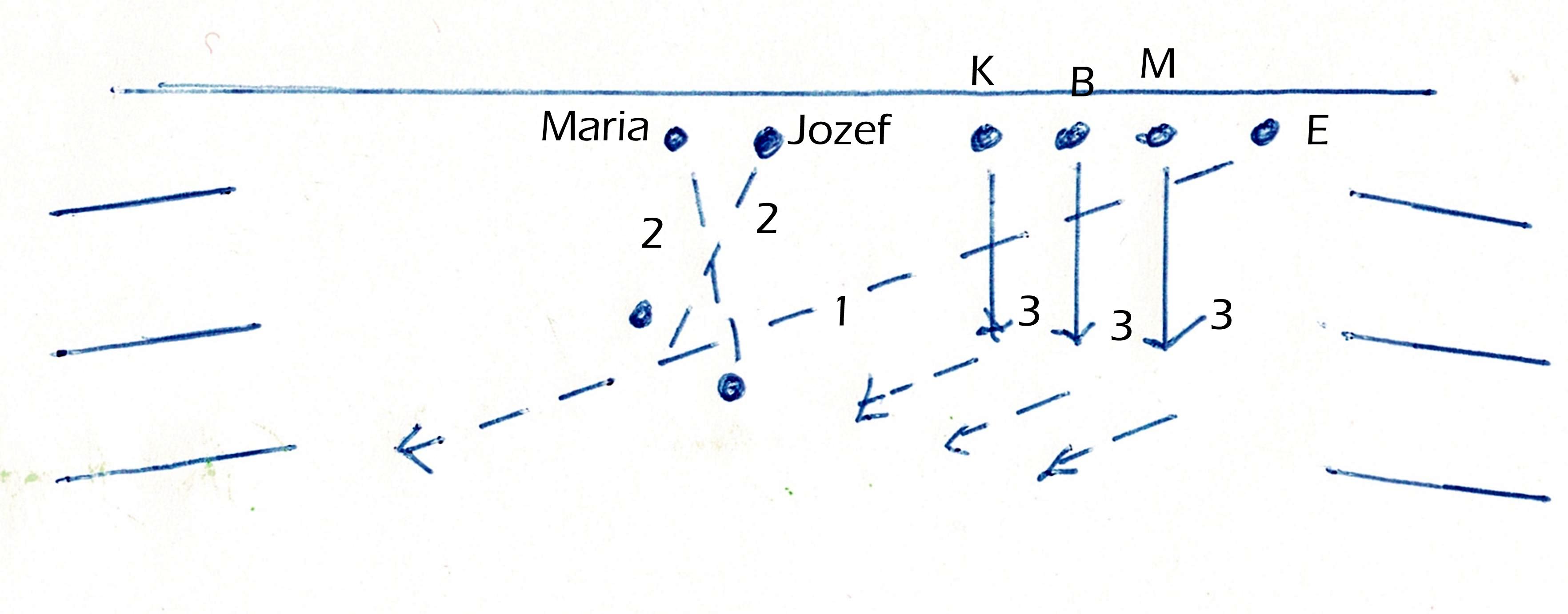 Hoe doet hij dat? Hij begint ermee de spelers op een kluitje bijeen te drijven (“als de spiering in de pan”), maar ziet dat dat zo niks wordt (veel te dicht op elkaar) en laat ze dan geordend, overzichtelijk uitwaaieren in een halve kring en stelt voor eerst eens even wat te zingen: met dat zingen spreek je de mensen ook weer aan in hun gevoel, zoals dus ook aan het begin, waarbij je al meteen een betrokkenheid hebt gecreëerd. Maar hij beseft dan opeens, dat hij toch eigenlijk eerst de hogere wereldorde moet groeten in z’n drie aspecten, alom tegenwoordig (dat uit zich in dat groeten naar drie richtingen) en dat gebeurt met eerbied. Dan volgen Jozef en Maria en het Kind + os en ezel en daar kun je dan al meteen enorm gaan variëren ‘in de manier van groeten! Doe je dat allemaal zo’n beetje hetzelfde dan wordt het stereotiep en oervervelend. Je kunt bijvoorbeeld even met je armen een wiegende beweging maken bij het kindeke, met je gebaren het robuuste, omvangrijke van de os aangeven, ook met je stem (en iemand kan bijv. even een geloei laten 19