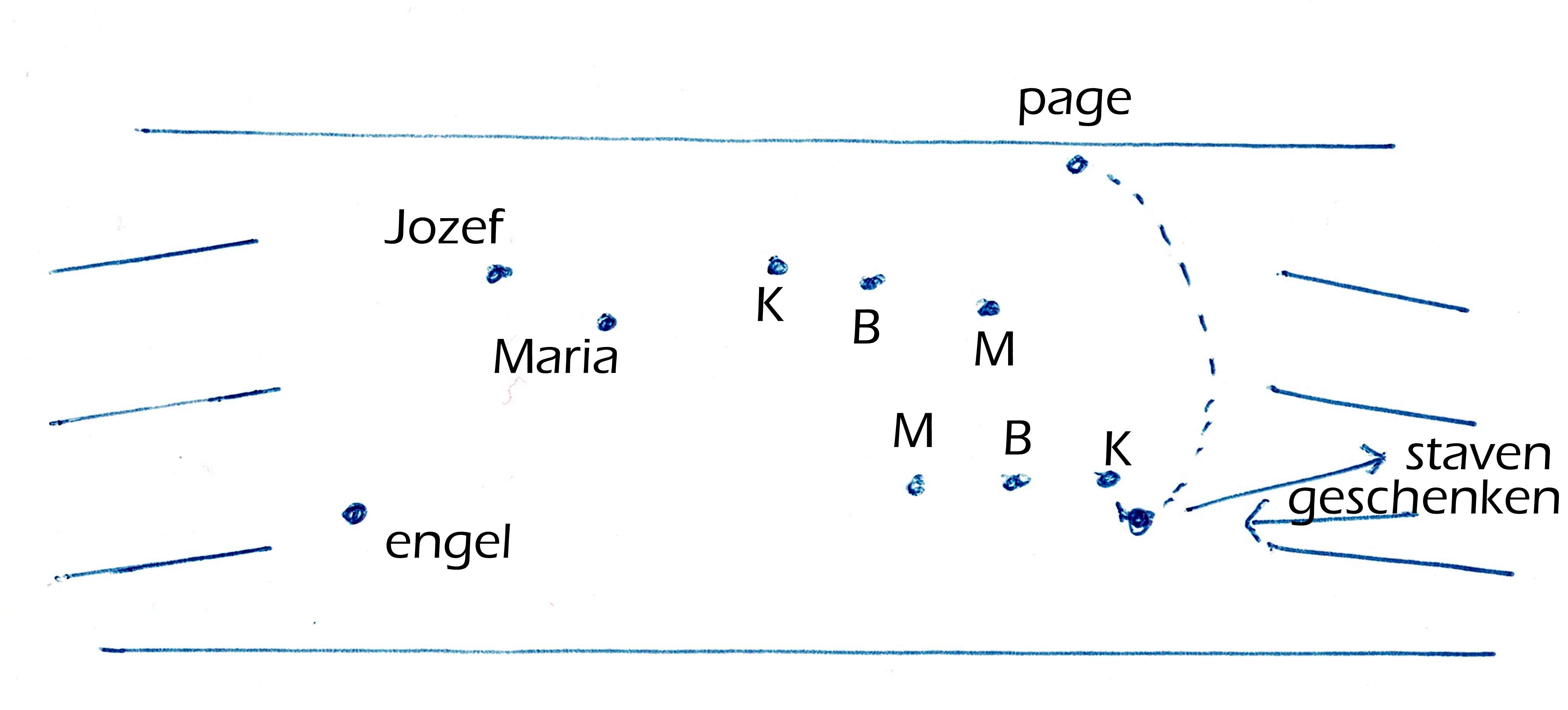 Dan de ommegang nr.5 (10-1-1976: in de zaal): Geboren is in Betlehem’. Daarna gaat de Engel naar links voor, de Koningen staan dan op. De Pagie haalt een krukje voor Maria met kind op arm.